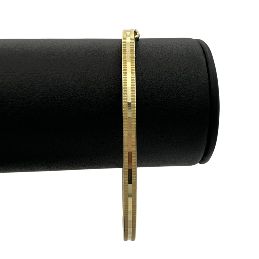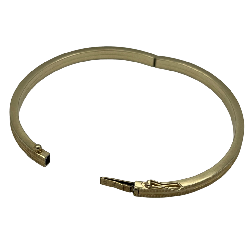 Vintage 14k yellow gold hinged oval bangle with a figure eight safety lock. The bangle is decorated with three registers of contrasting ridged design.
