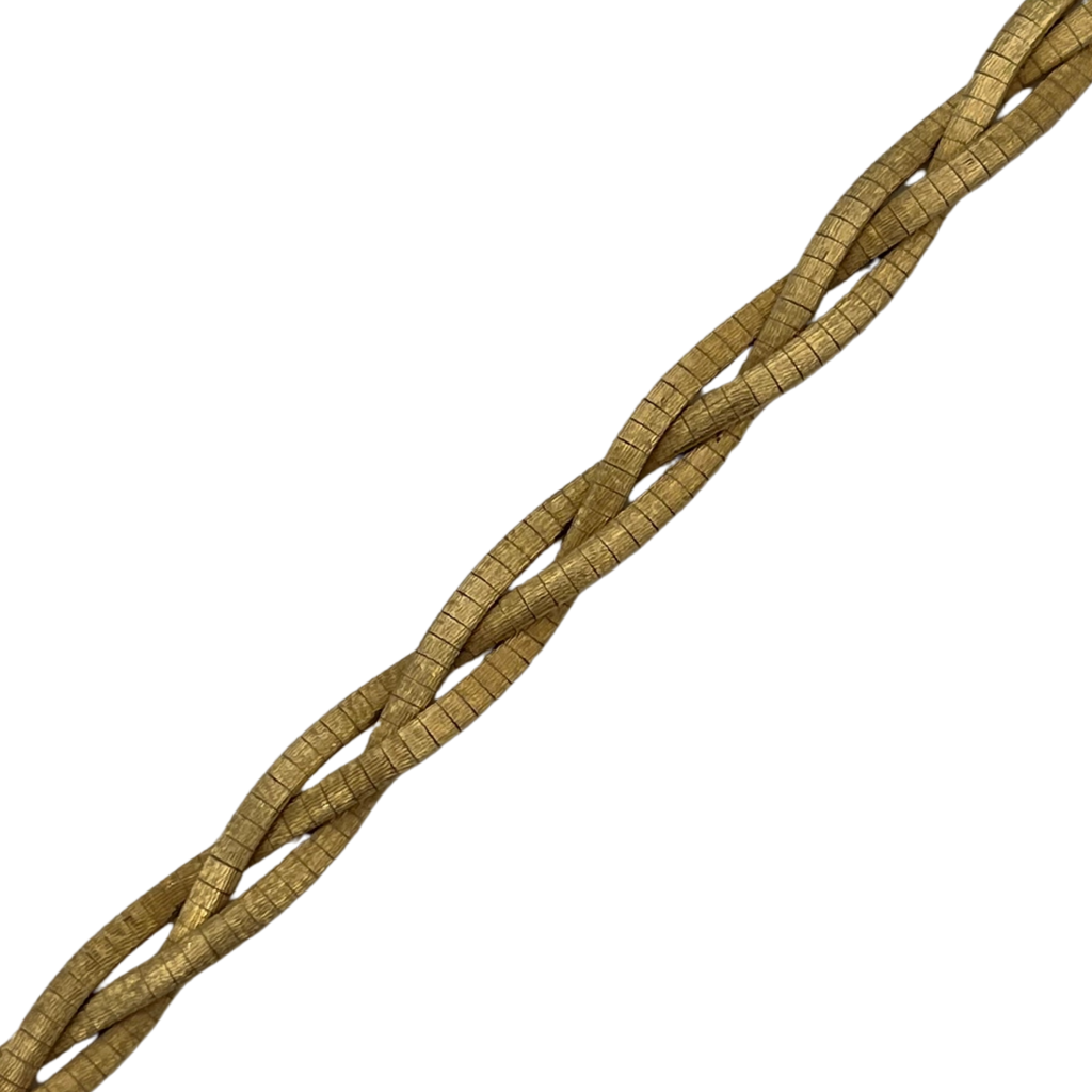 Vintage Italian three-strand braided flat spaghetti link featuring a brush finish. Attached with a push clasp and features a figure eight safety latch.