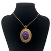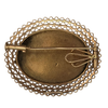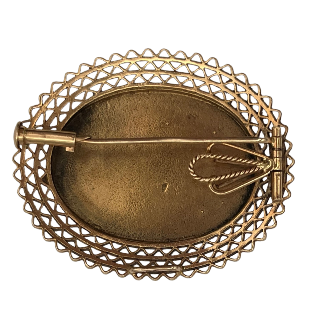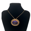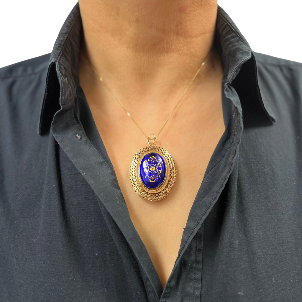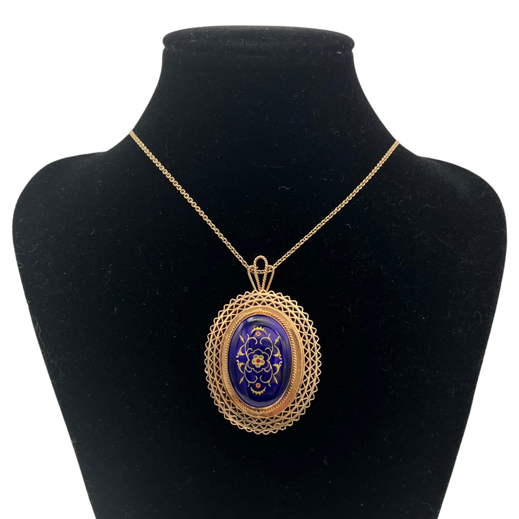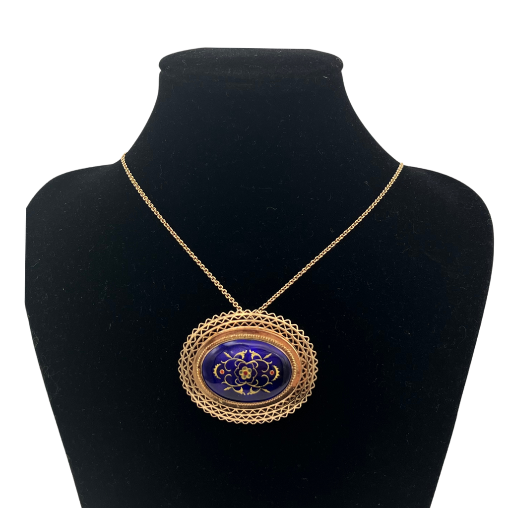 Lovely antique 14k rose gold pendant with an oval blue enamel flower design surrounded by a scalloped open lattice frame. The pendant features two pendant attachments and a brooch pin.