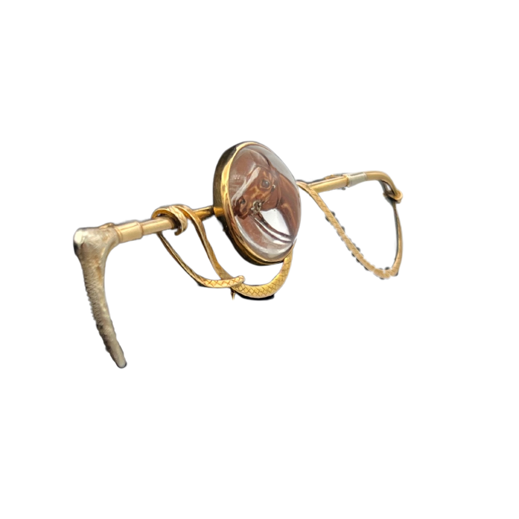 A stunning example of reverse intaglio painted crystal. These pieces became quite popular in the late Victorian era and required great skill to both carve and paint with minute details. This particular piece also has exceptional detail in the whip itself with different engravings demarking the handle (white gold) and leather whip.