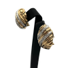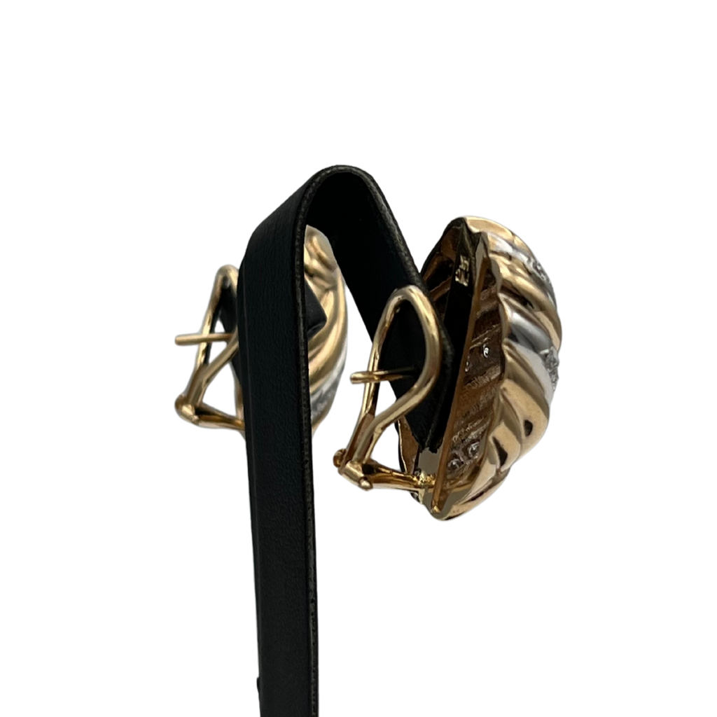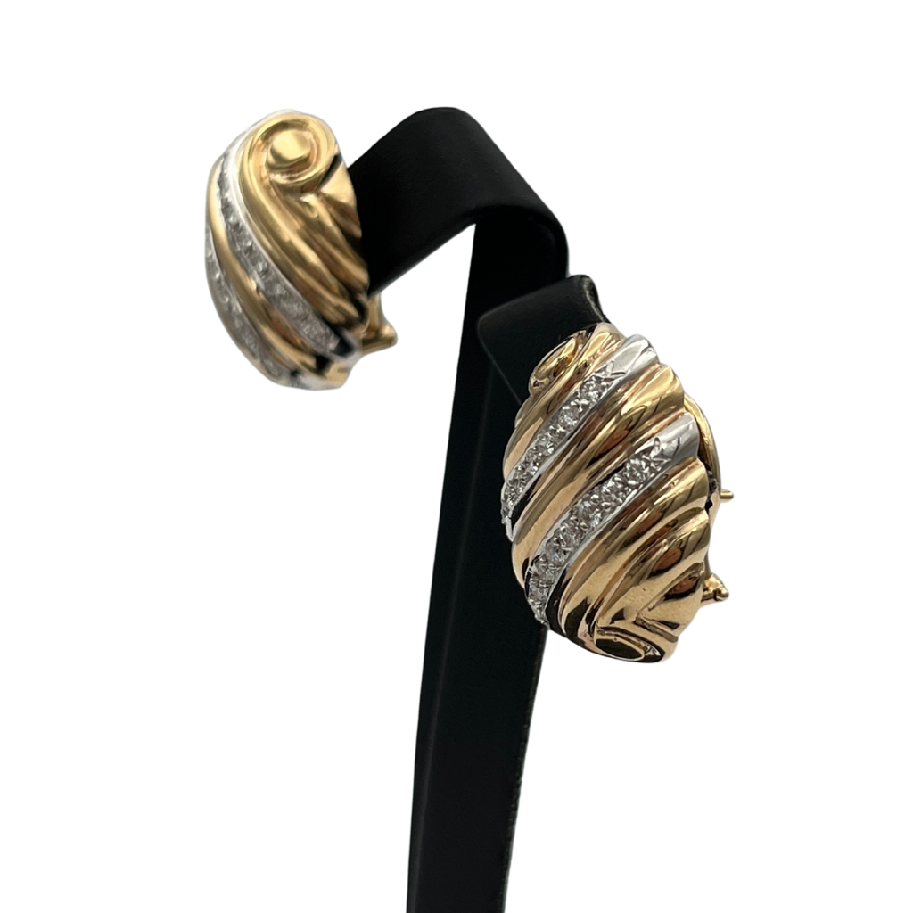Vintage 14k yellow gold and pavé diamond dome earrings with an elegant ridged scroll motif. Earrings are worn with a post and omega clip mechanism.