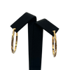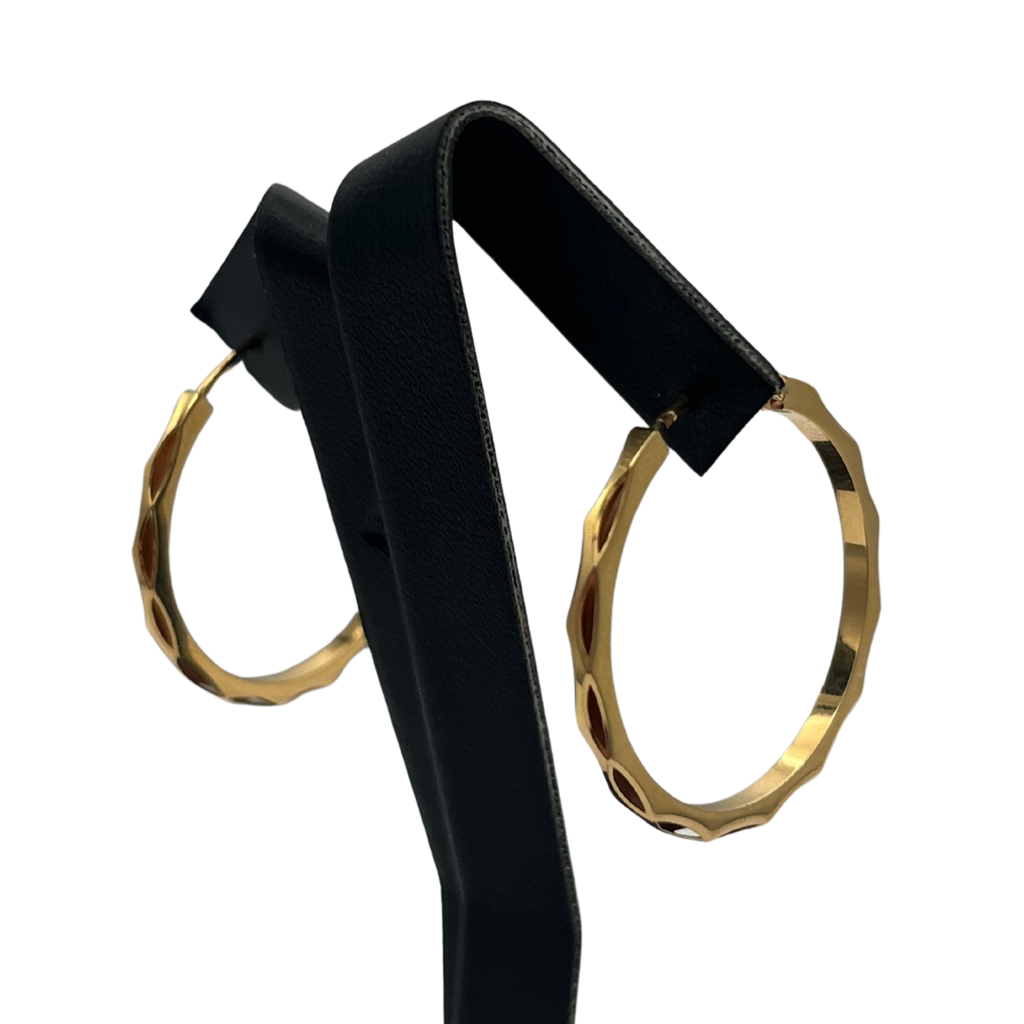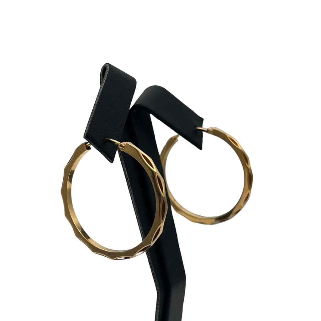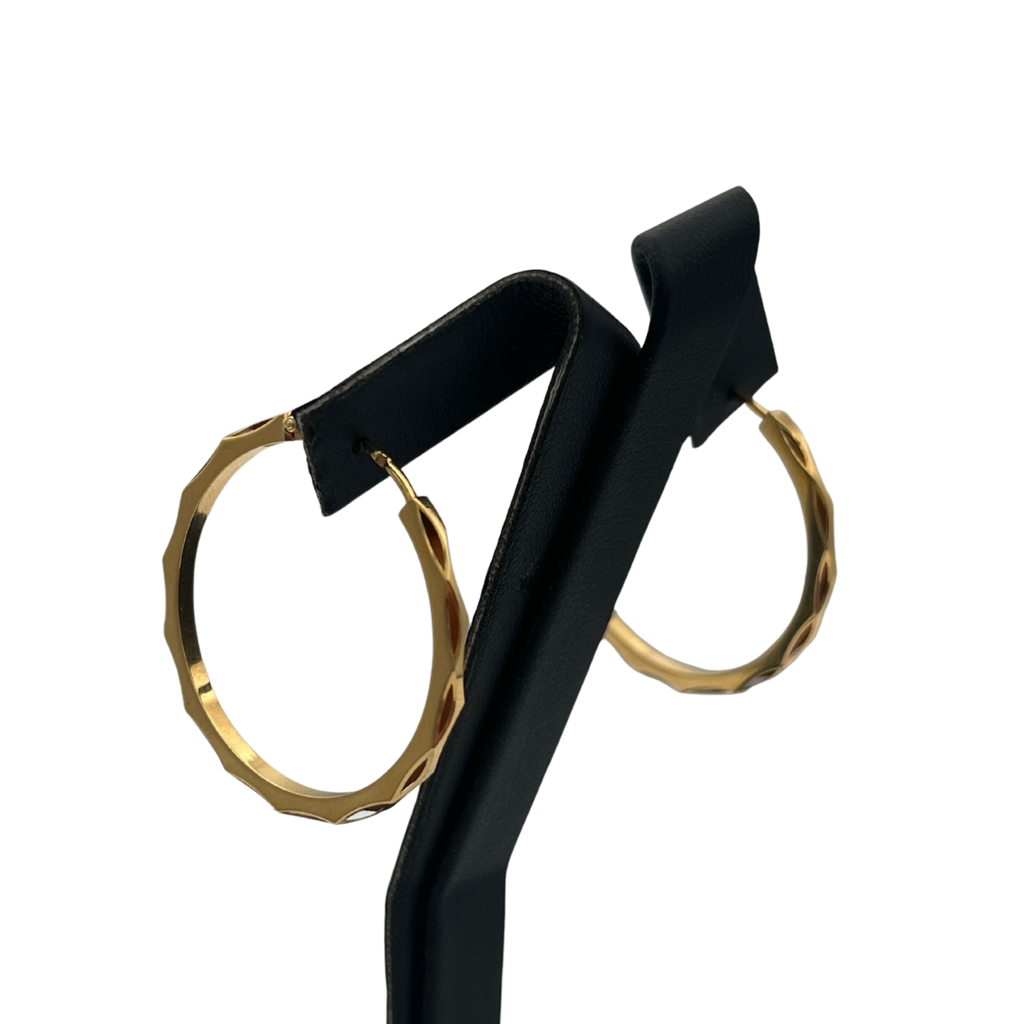 Vintage French 18k yellow gold hoop earrings with a cut-out motif on the exterior surface.