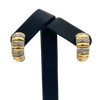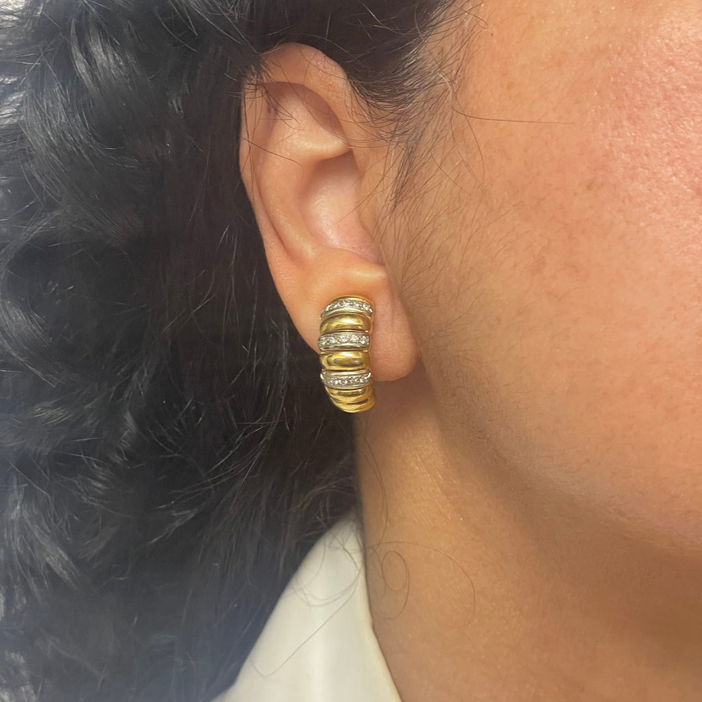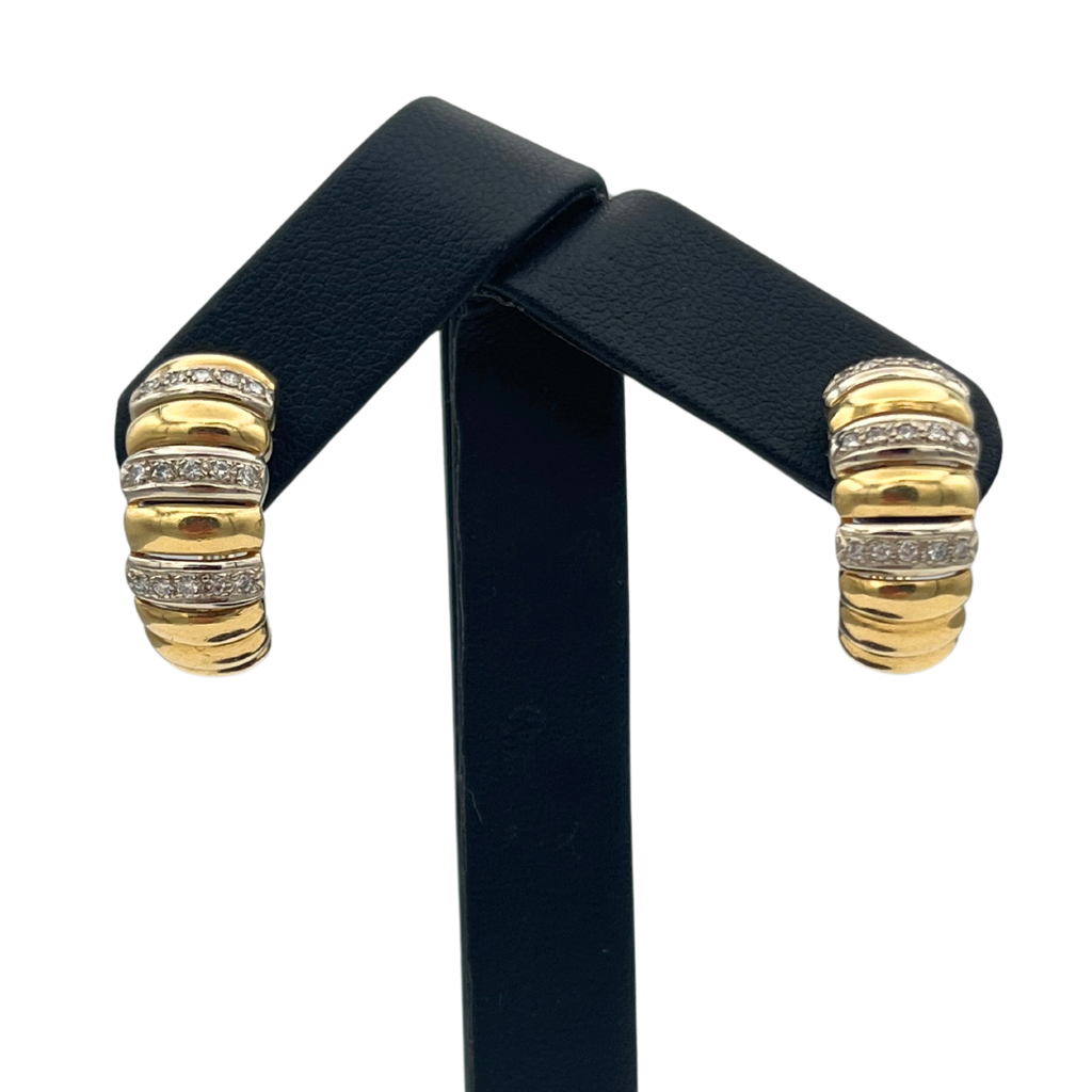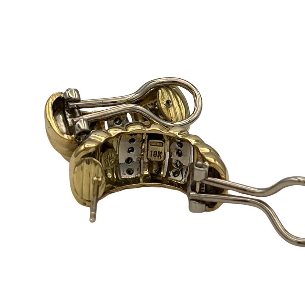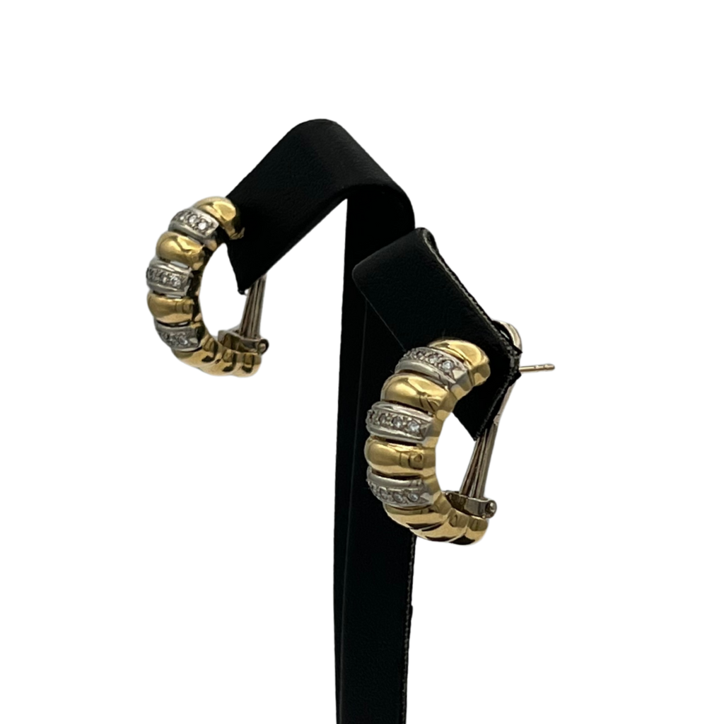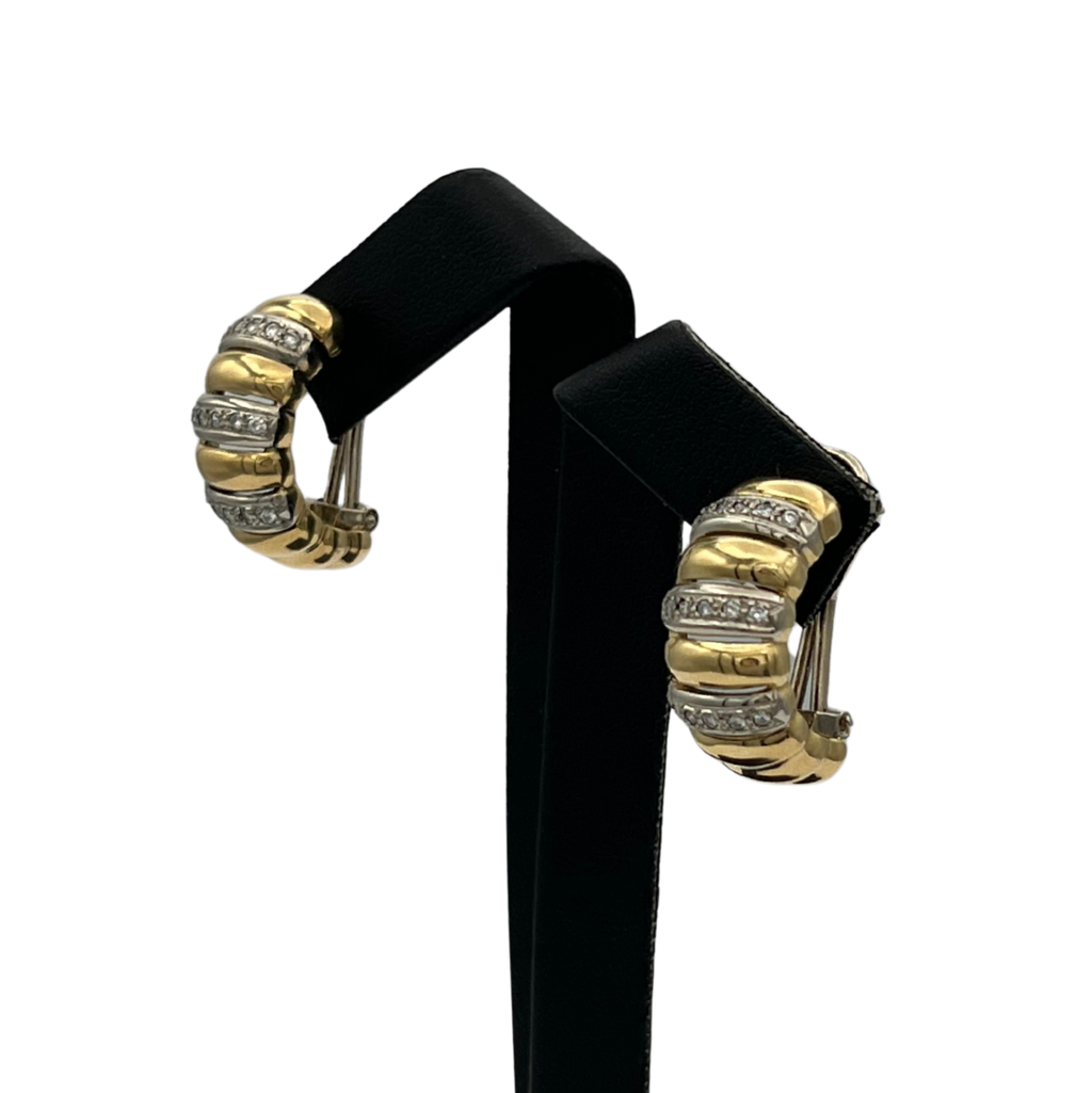 Vintage Italian 18k Yellow and White Gold Diamond Shrimp Style Earrings. These earrings have an omega clip and post closure mechanism.