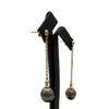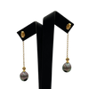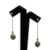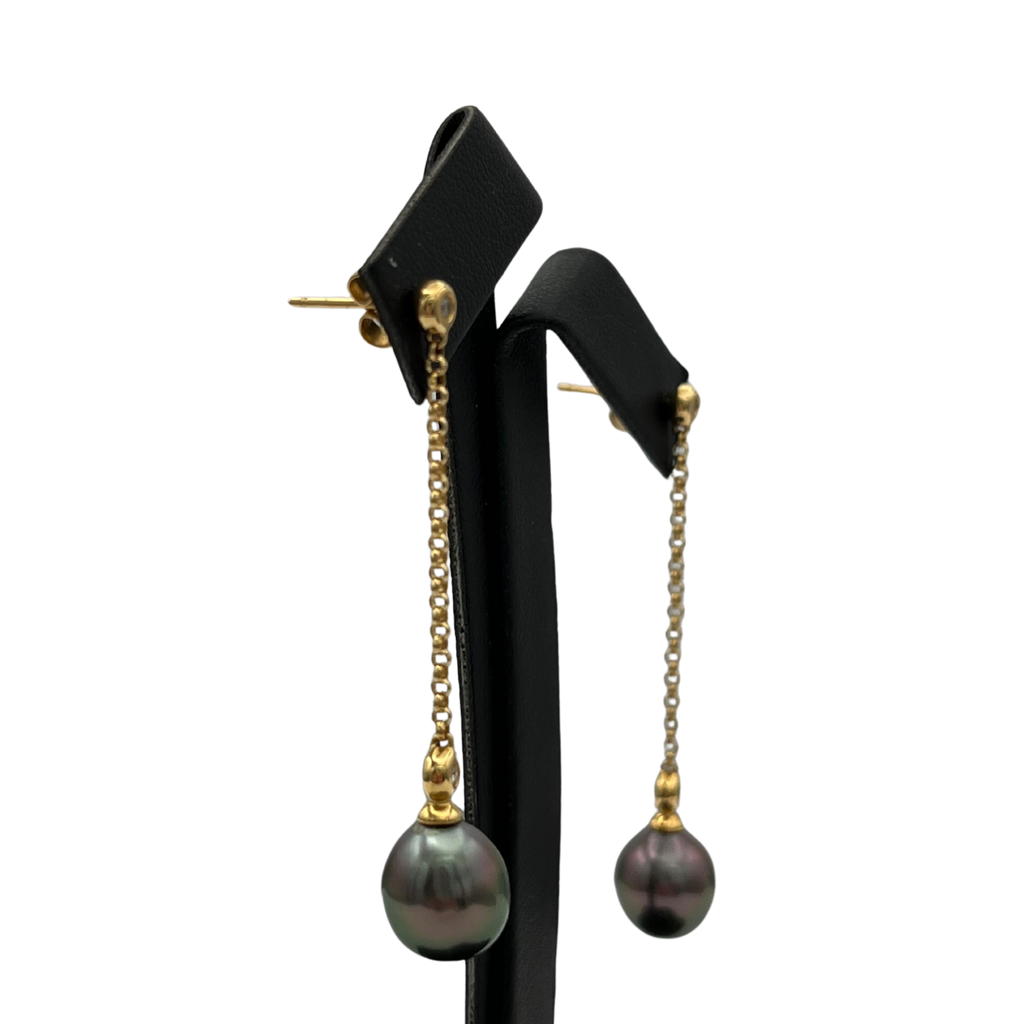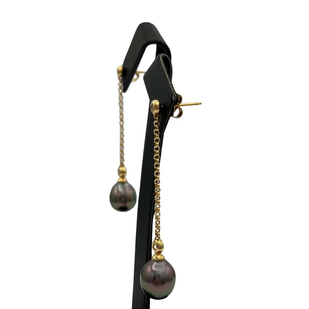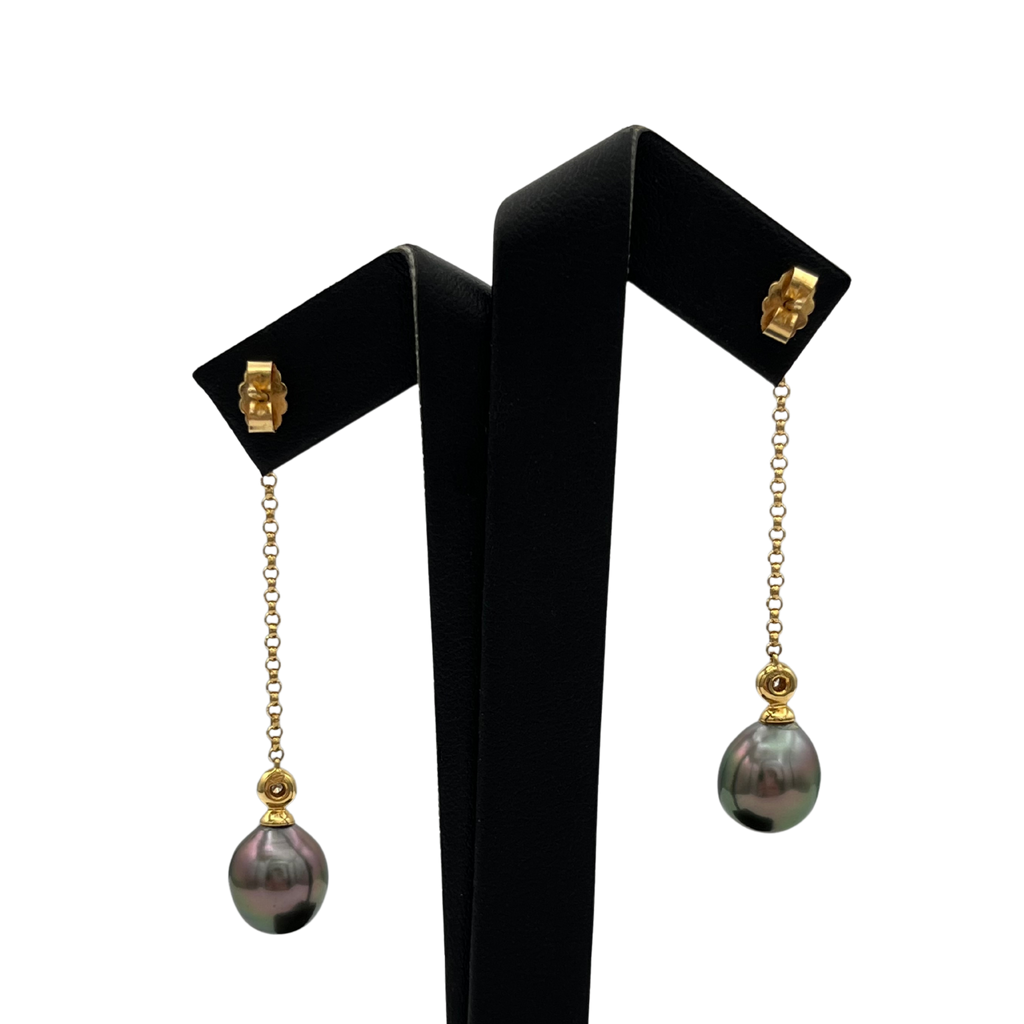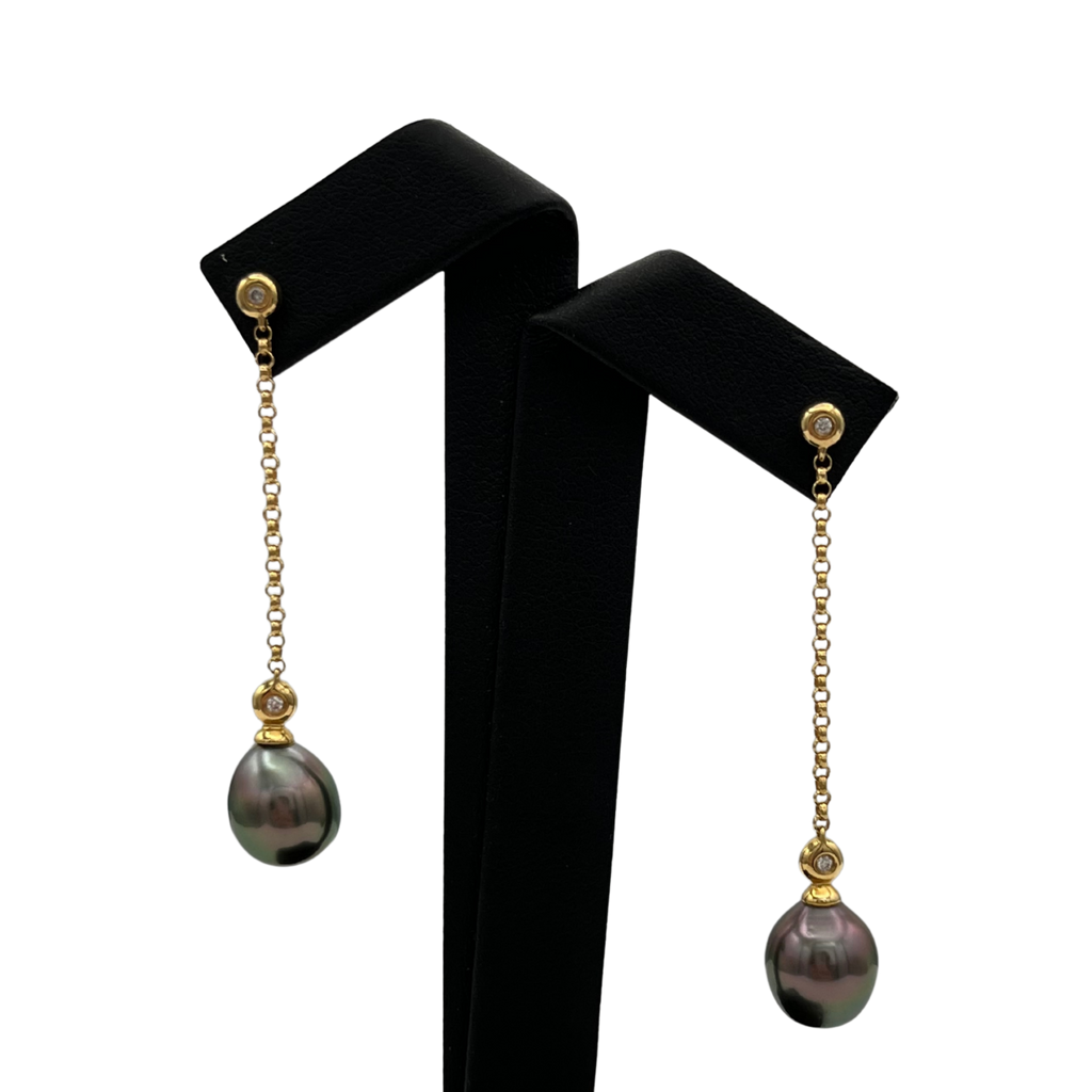 Beautiful Tahitian pearl drop earrings. Each pearl is suspended on a 1.6mm round link chain, with a bezel set diamond. Earrings are worn with a post and butterfly back.
