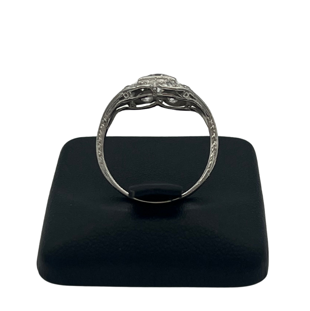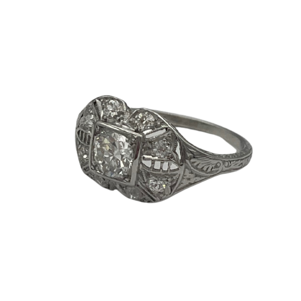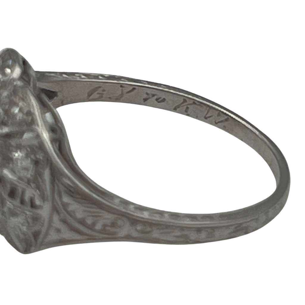 Stunning antique Edwardian diamond ring in platinum featuring milgrain and open work design and an engraved scroll and palmette motif along the band.