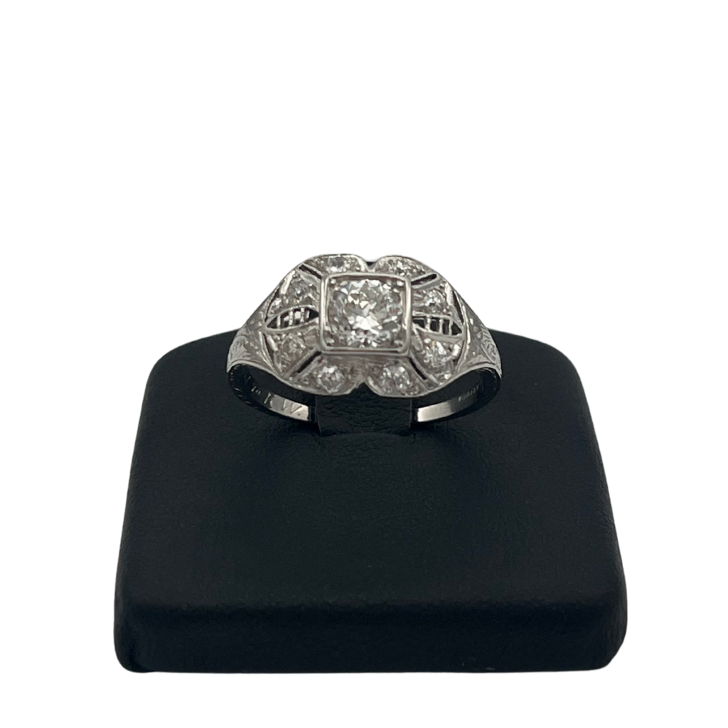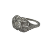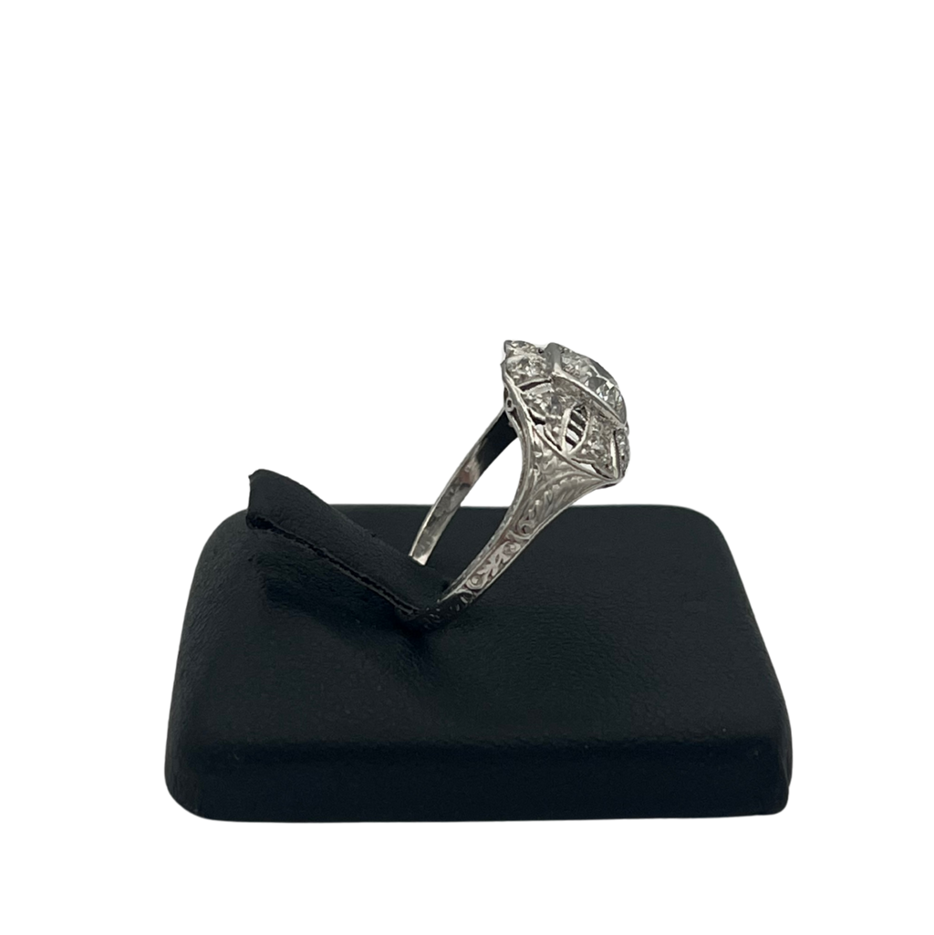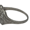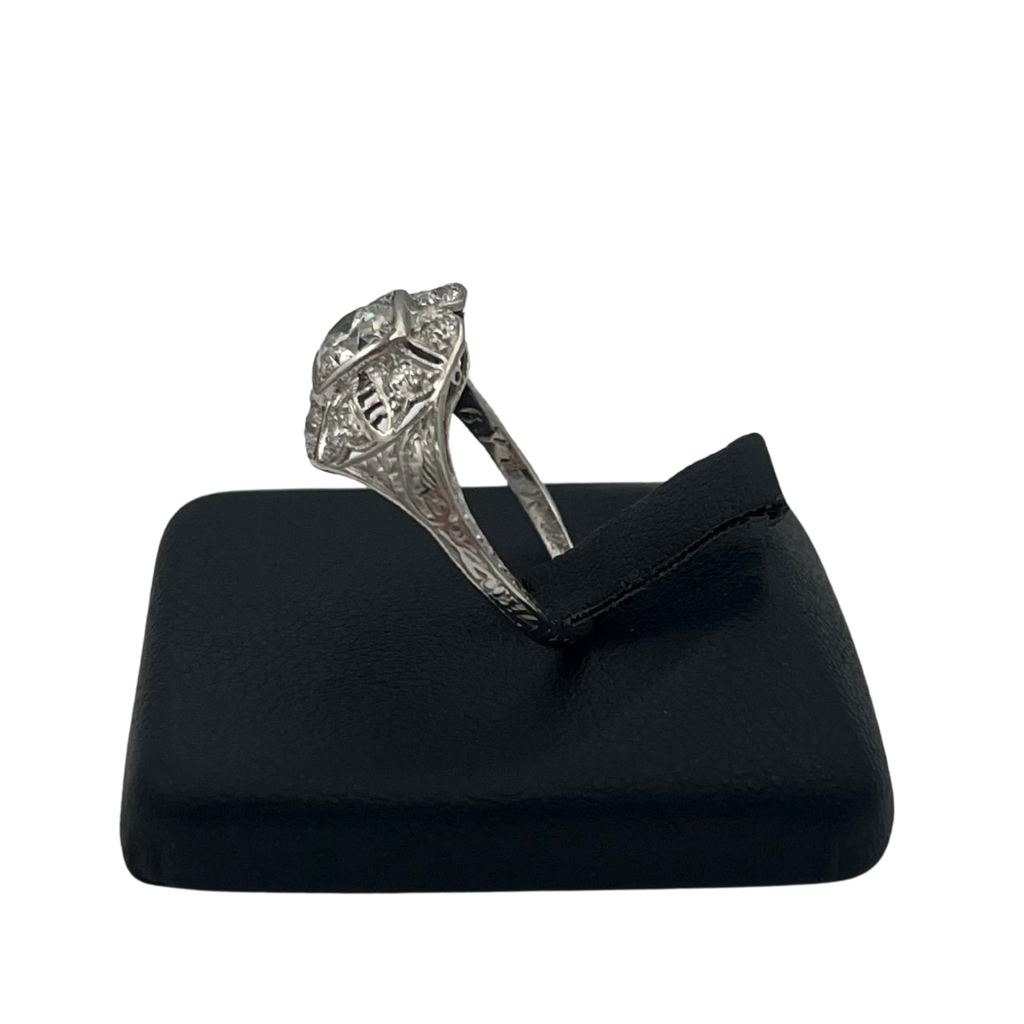 Stunning antique Edwardian diamond ring in platinum featuring milgrain and open work design and an engraved scroll and palmette motif along the band.