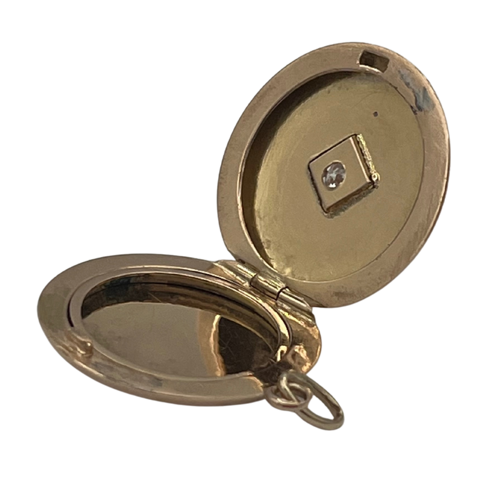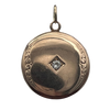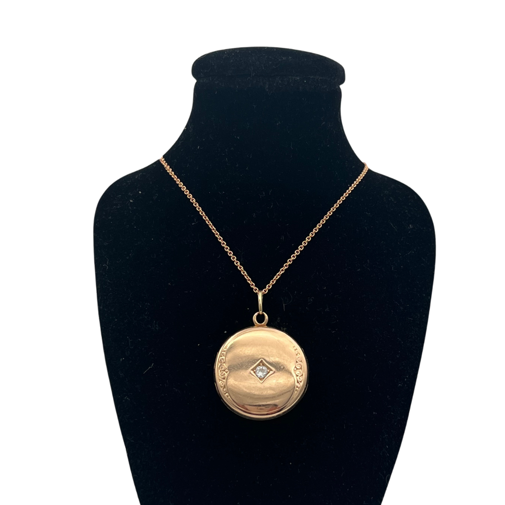 Absolutely precious antique Edwardian locket in 14k rose gold with a center diamond and engraved scroll detailing on the sides of the locket dating to the early 1900's.
