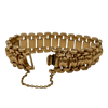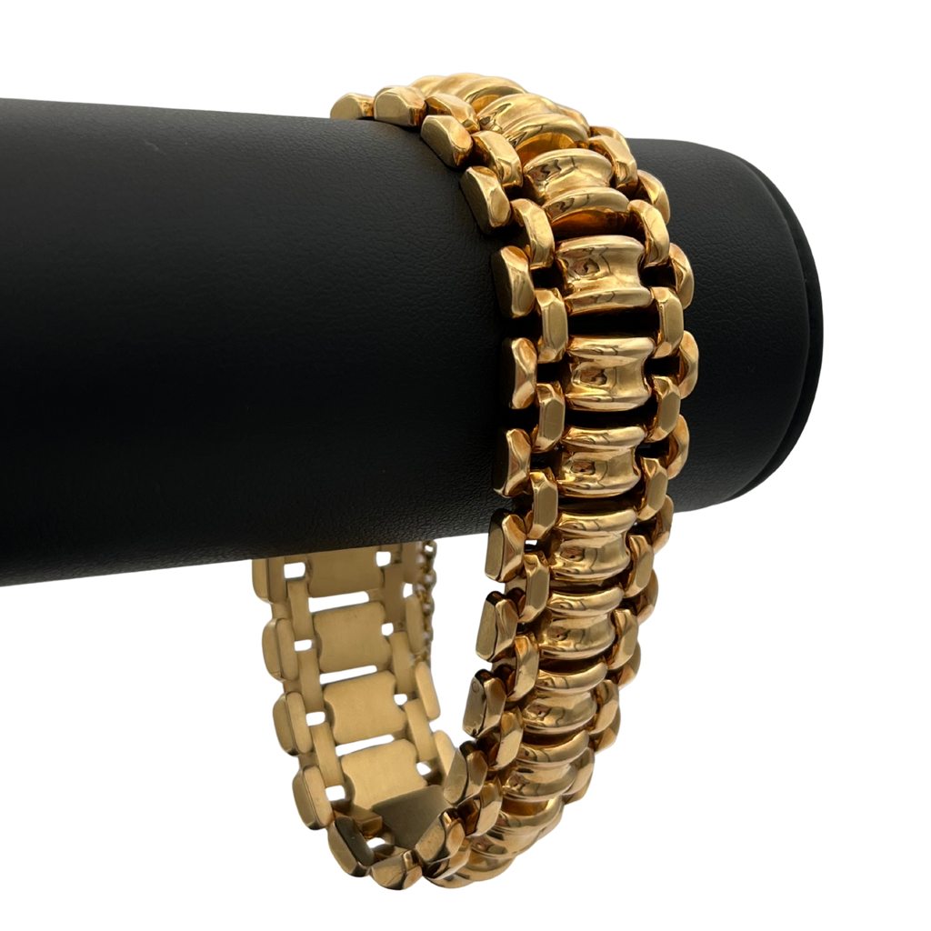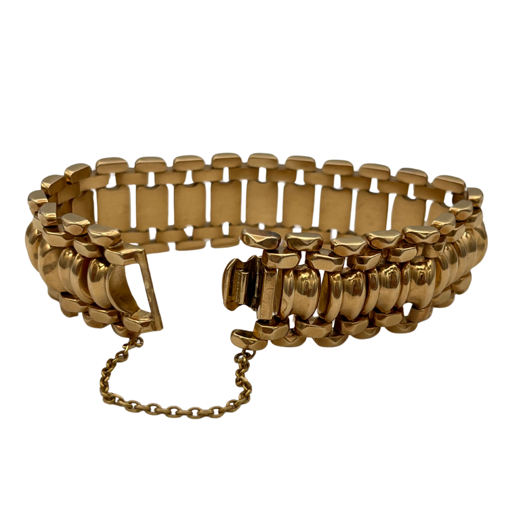 Vintage heavy hollow 18k rose gold link bracelet with a matching link hinged lock and 2 1/4 inch safety chain.