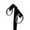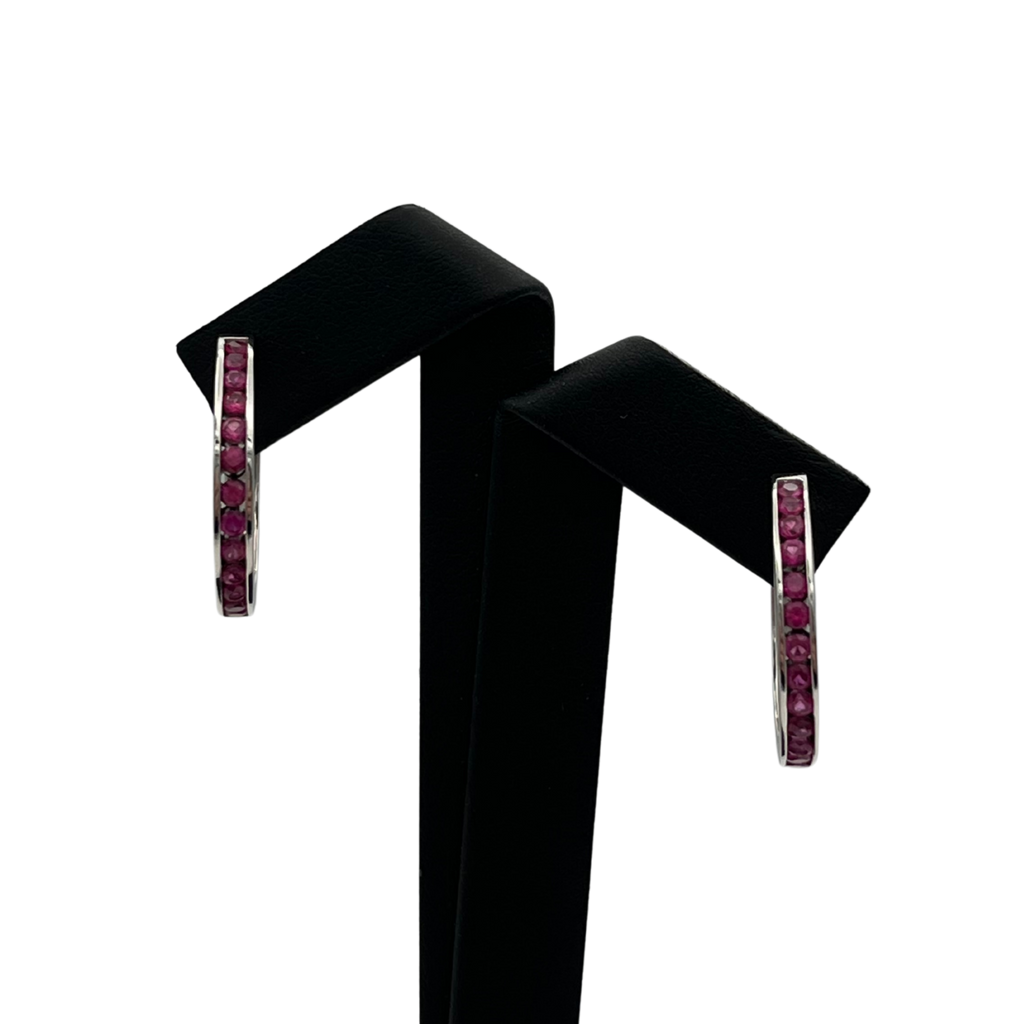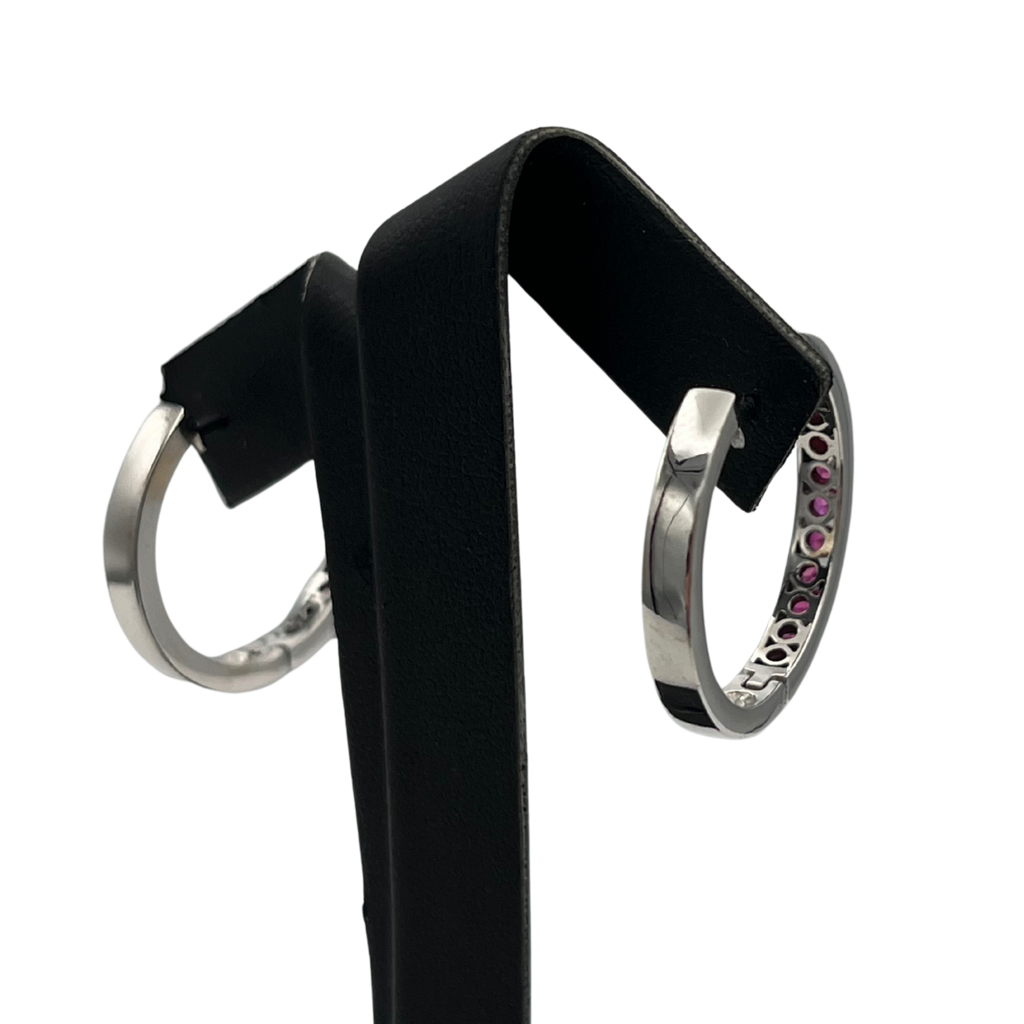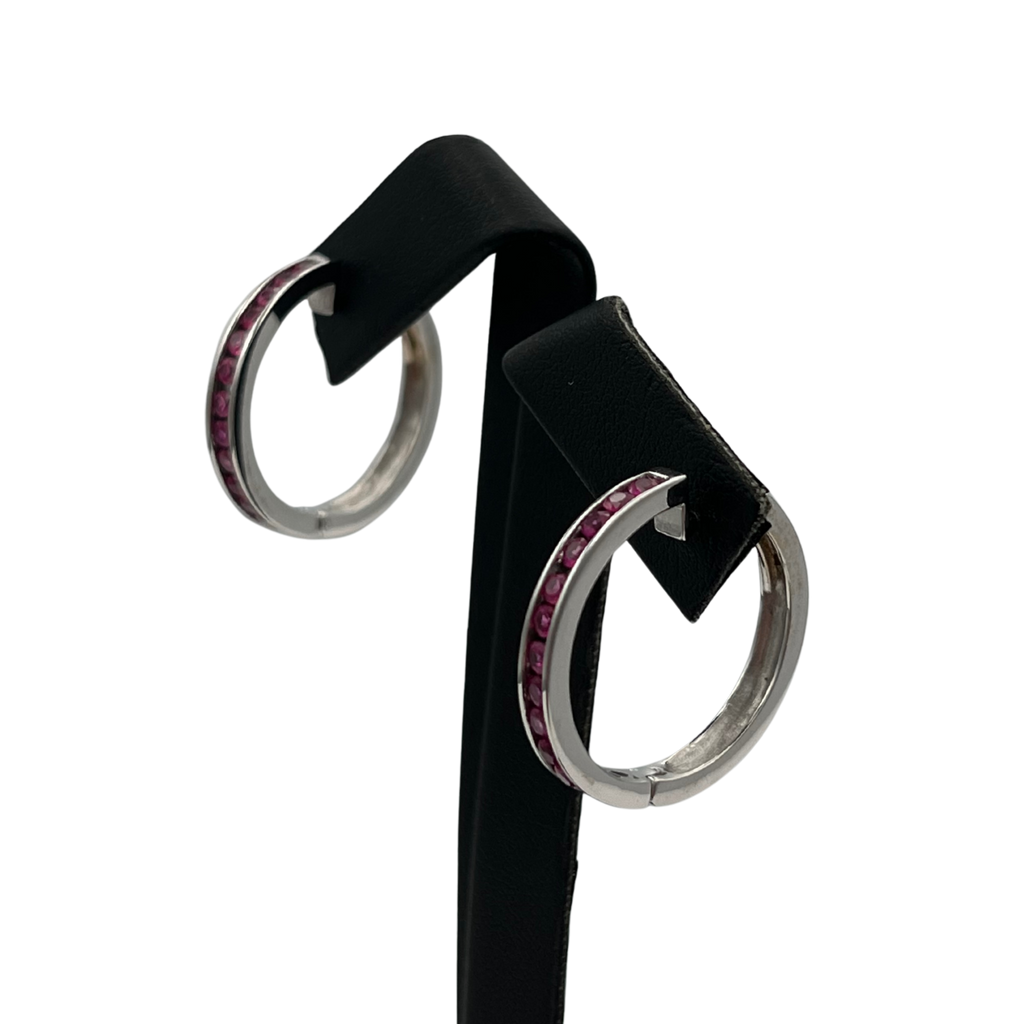 Vintage 18k white gold hoop earrings with a line of channel set pink sapphires running along the front of the hoop.