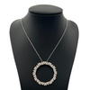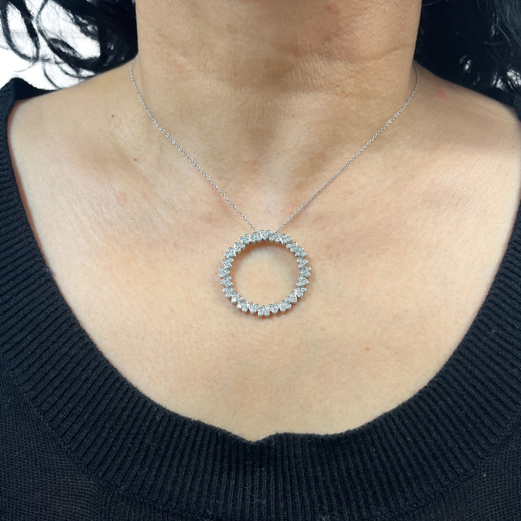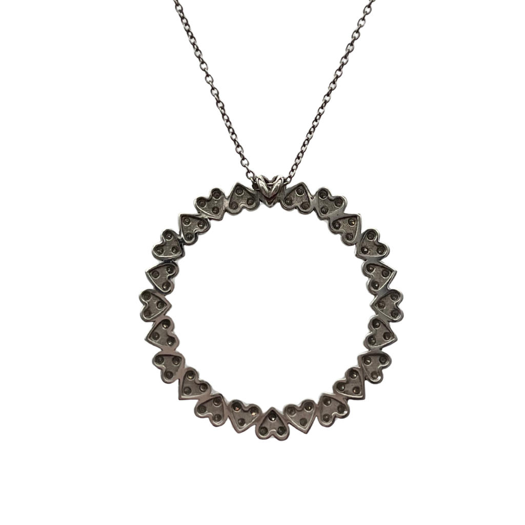 Vintage Birks circular pendant with bezel set diamonds (three in one setting) in an 18k white gold continuous heart motif on a white gold chain.