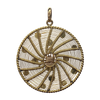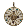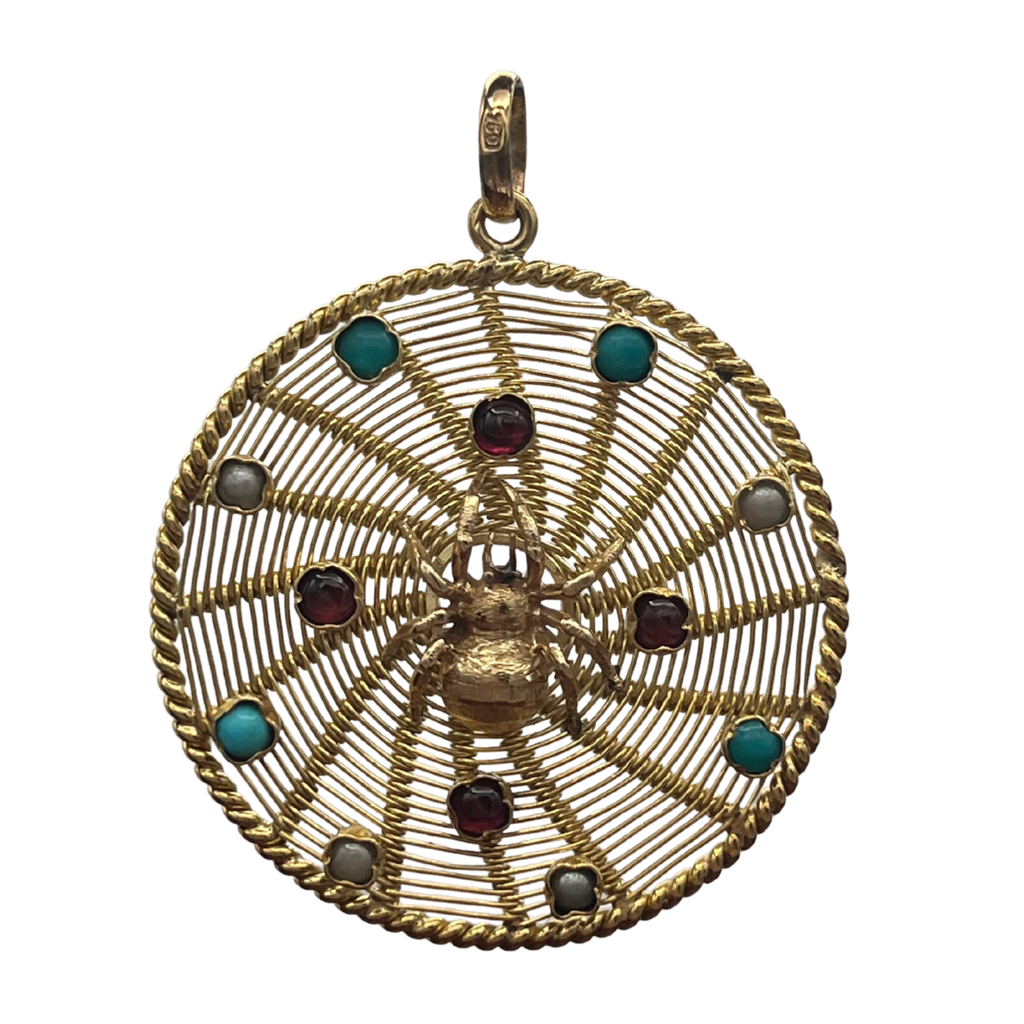 Vintage round pendant of an 18k rose gold spider on a web made up of interwoven yellow gold wire. The spider web is embellished with bezel set garnet, turquoise, and pearls.