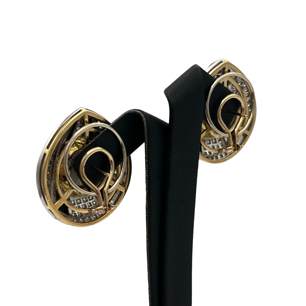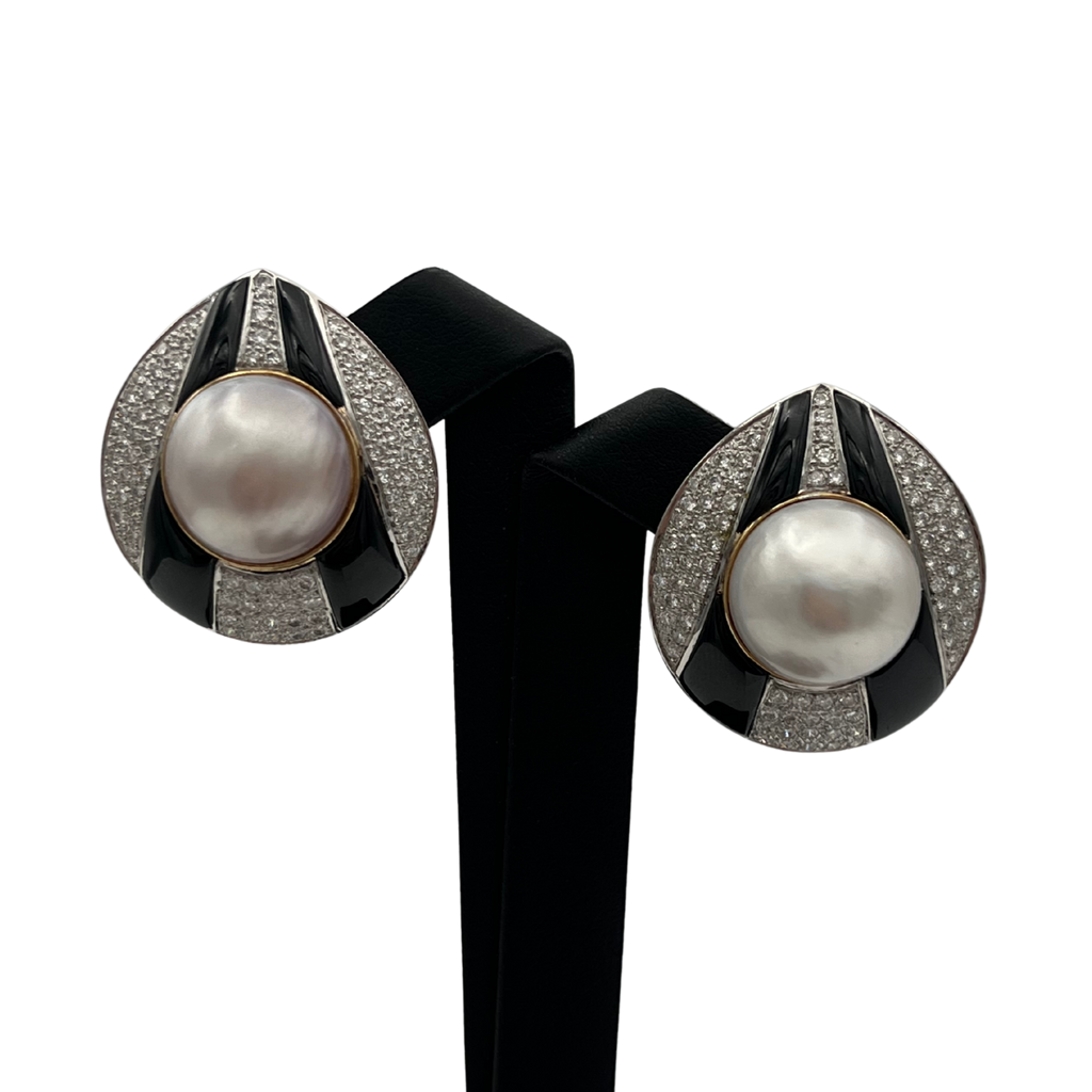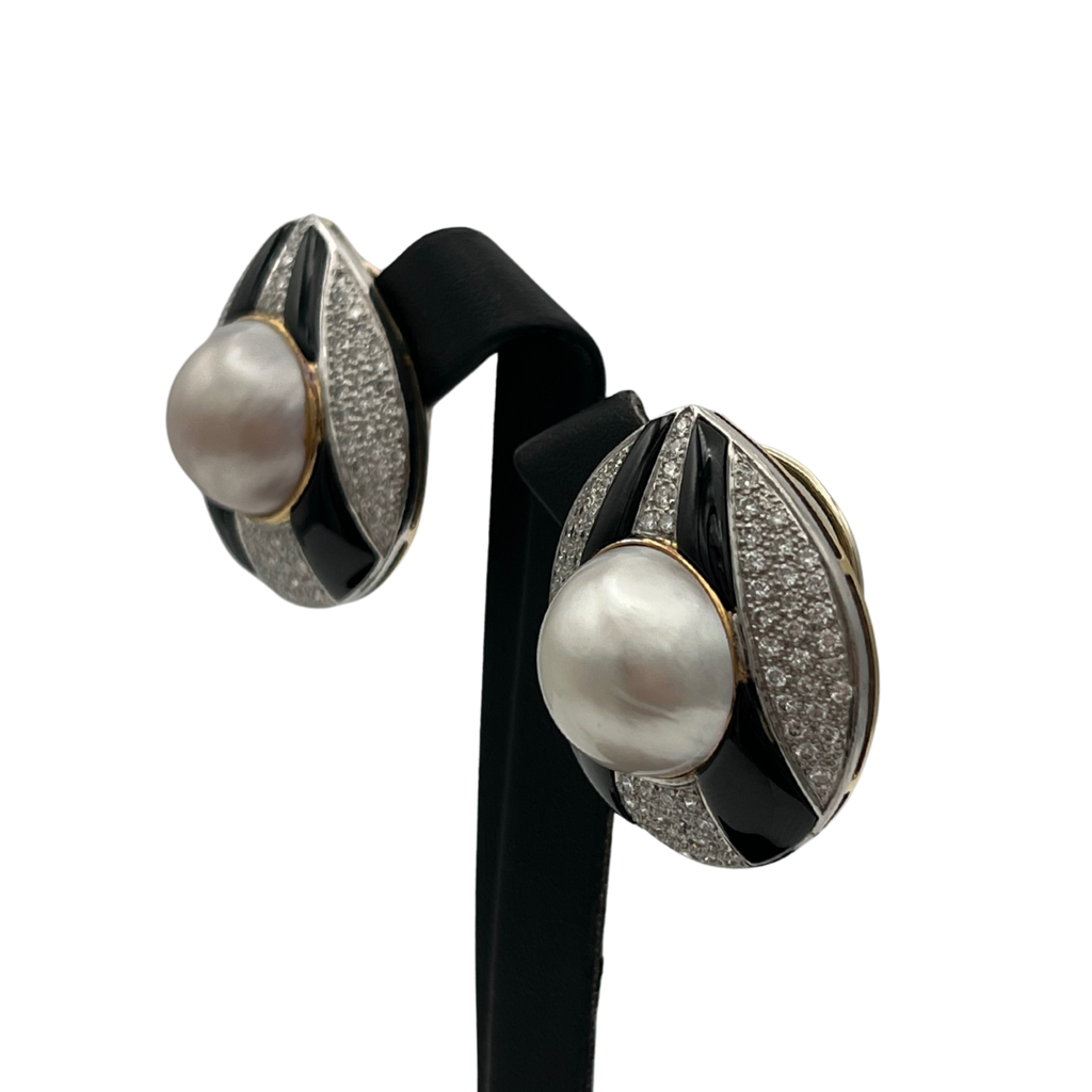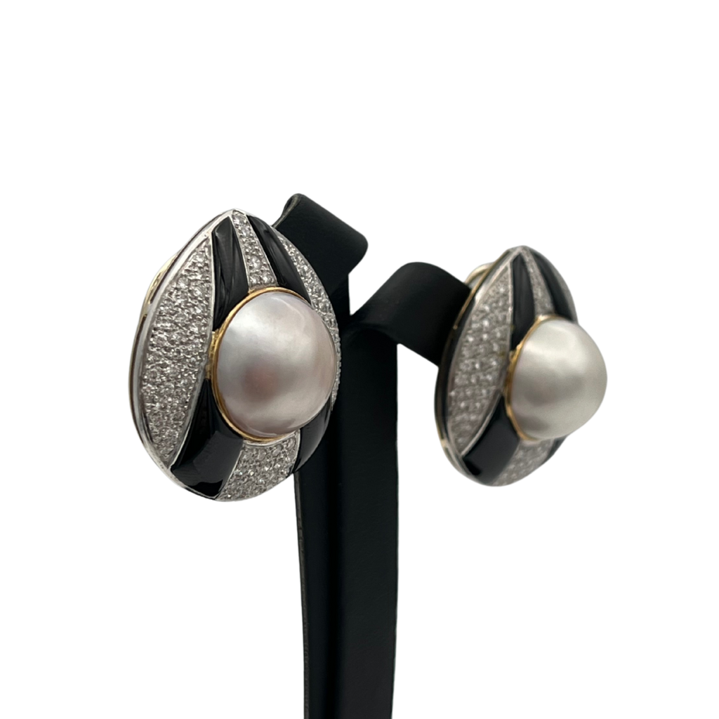 Bold and beautiful hand made vintage earrings featuring fabulous iridescent Mabe pearls bezel set in a rounded teardrop frame of pavé diamond and black onyx cabochon cut alternating stripes. The earrings fasten with a post and oversized hand made omega clip.