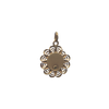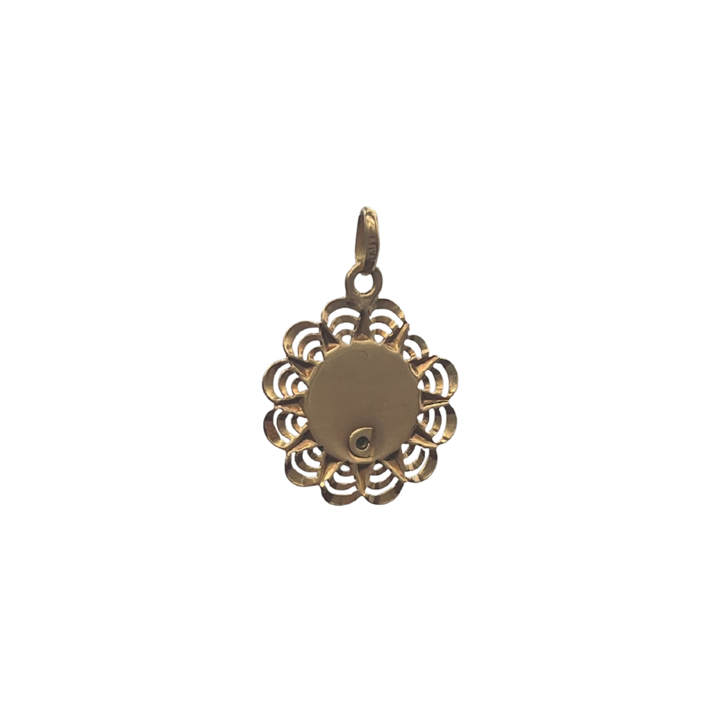 Vintage 18k yellow gold Virgin Mary pendant in an open scalloped-motif frame.