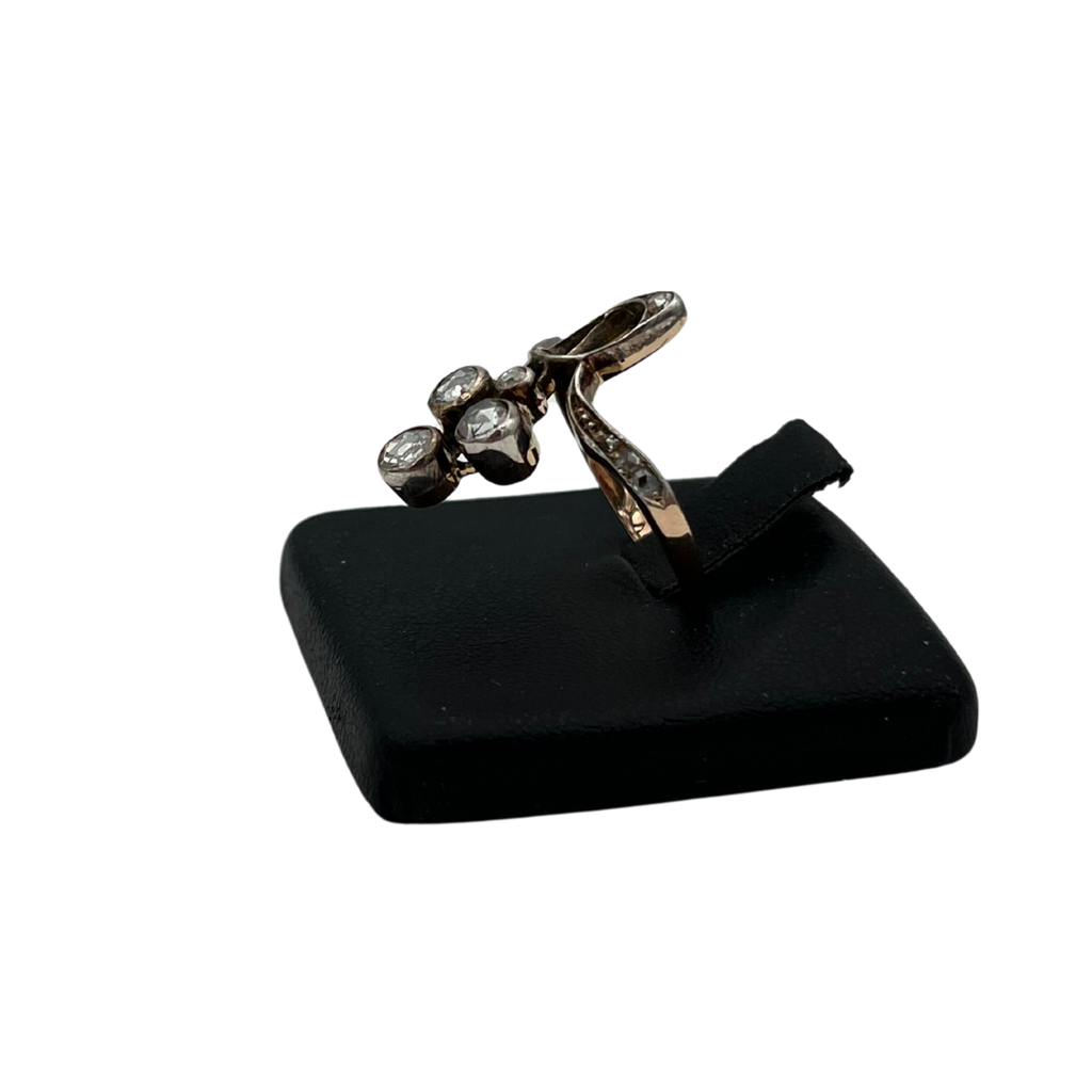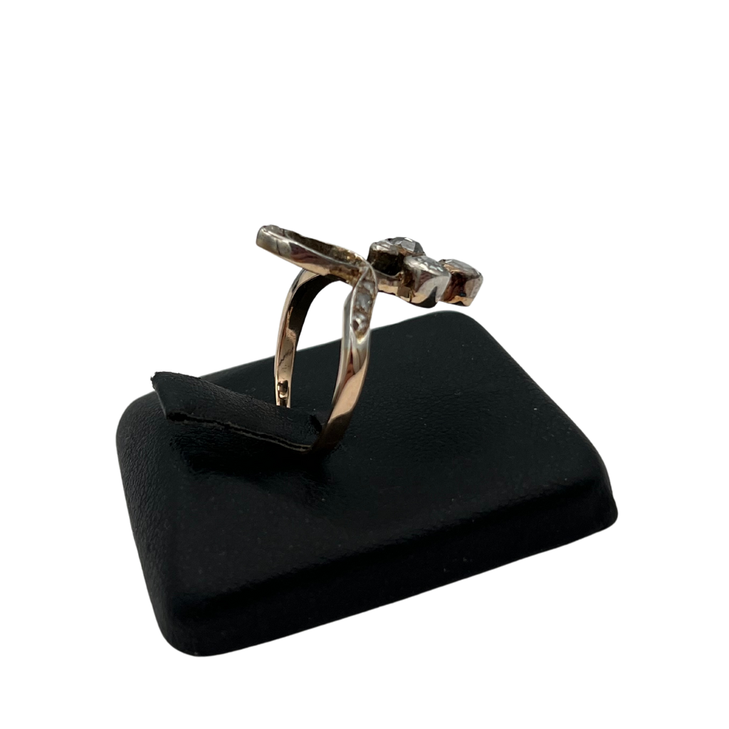 A unique antique ring featuring rose cut diamonds set in silver on 14k rose gold.