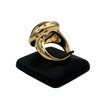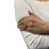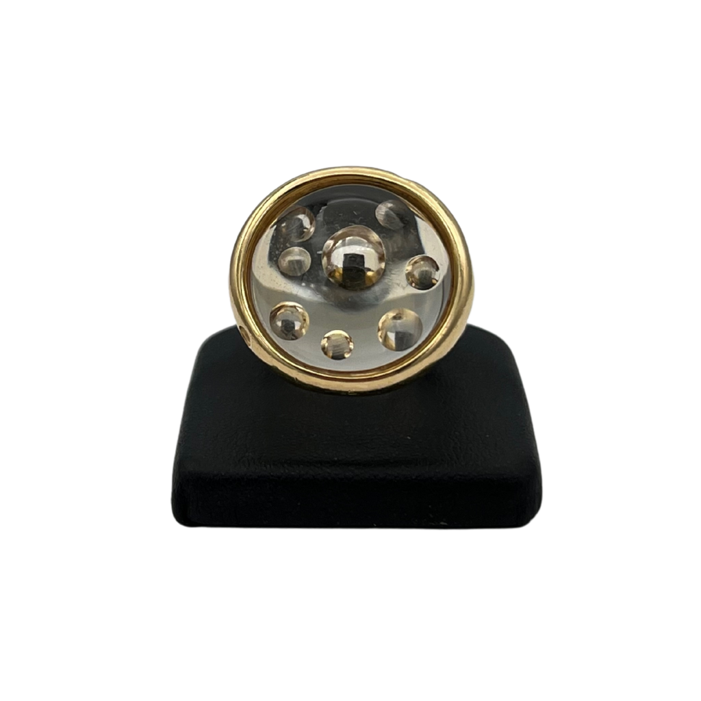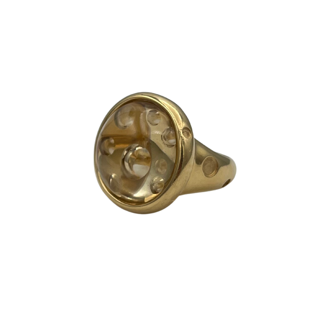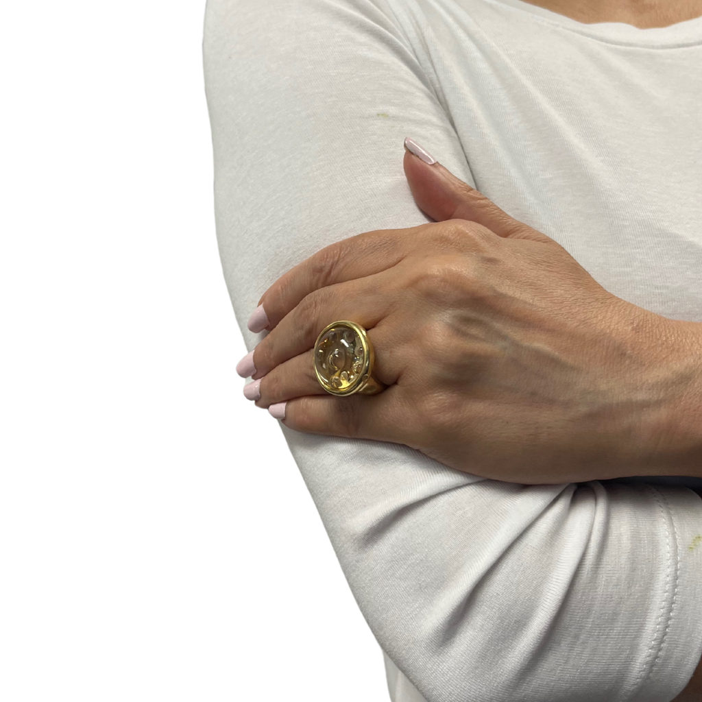 A beautiful light yellow cabochon cut citrine hand carved from the back to give the appearance of bubbles in the stone. Further, the ring is designed with additional crevices in the band to add to the design.