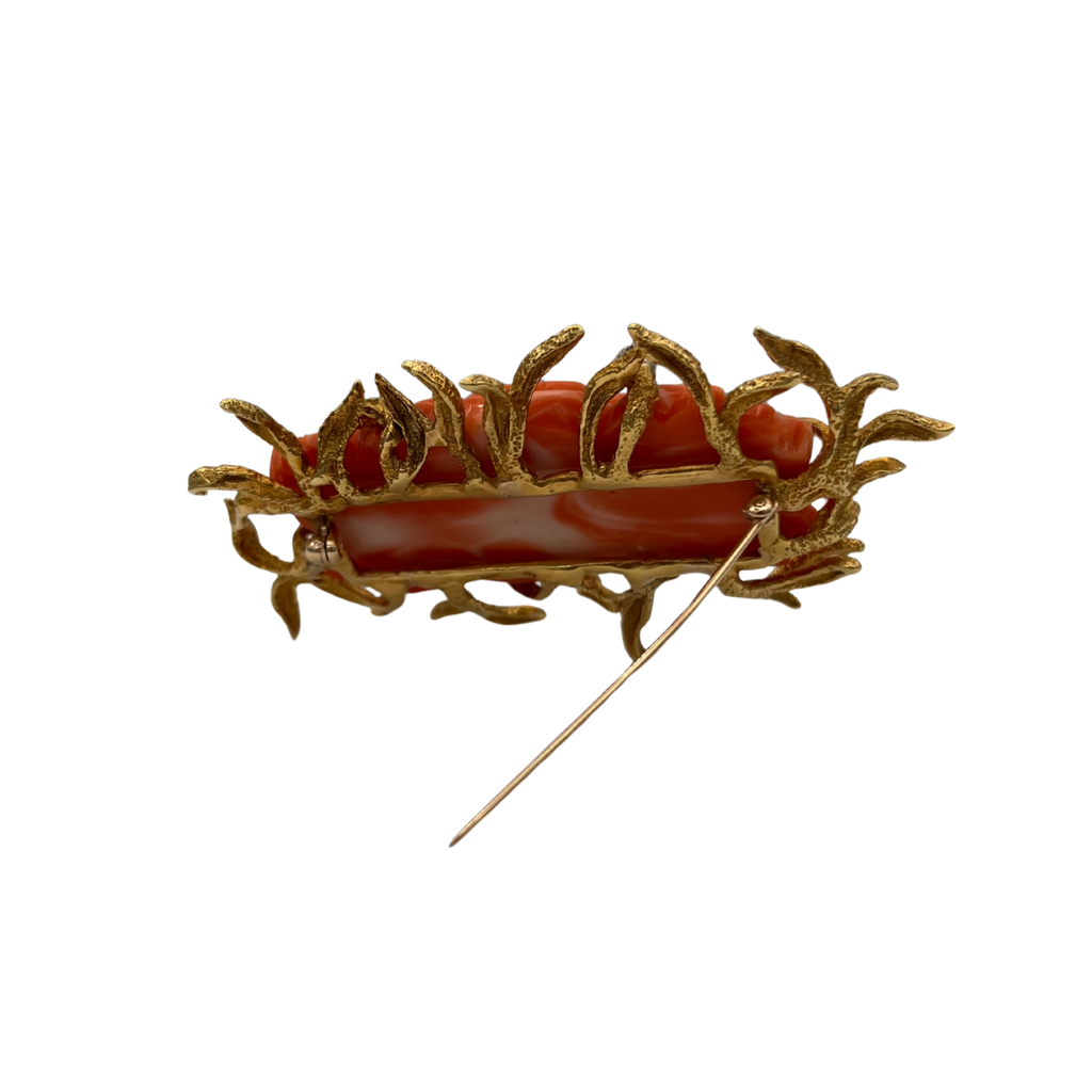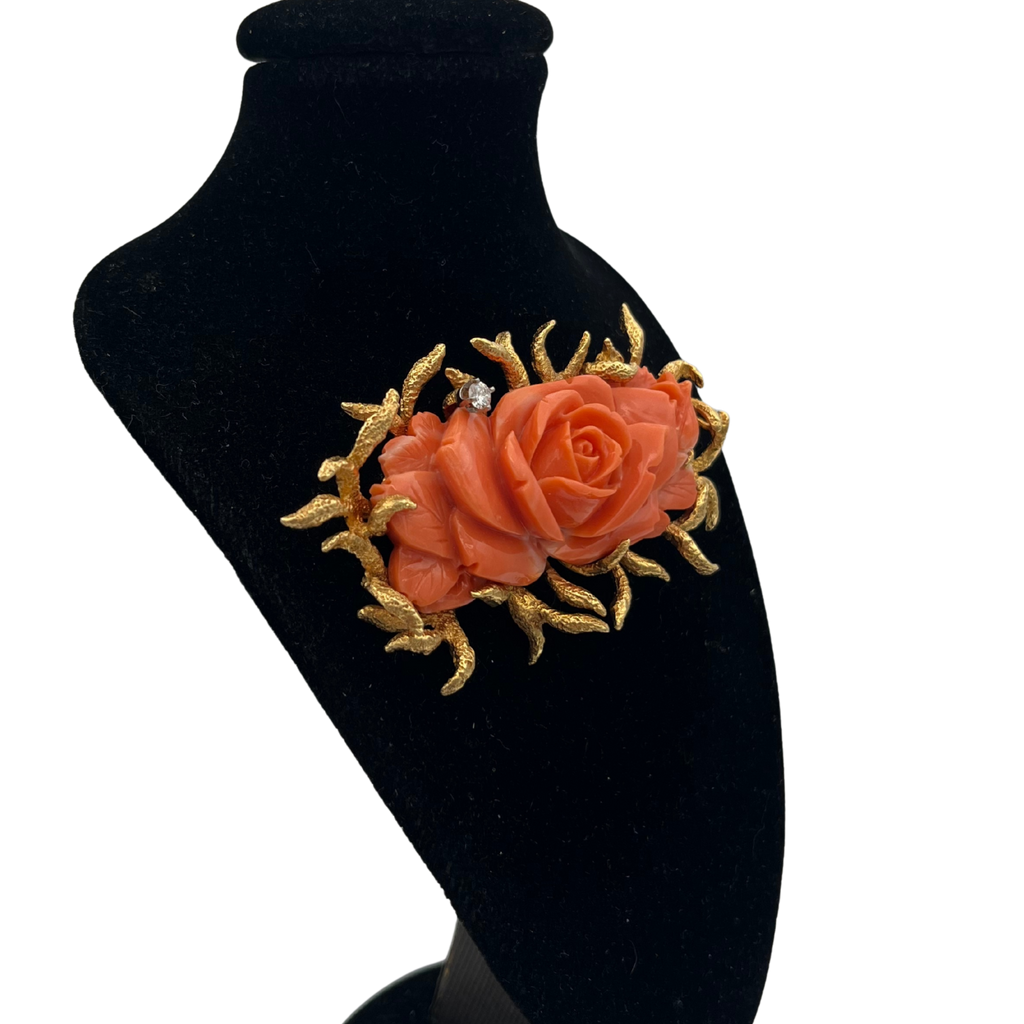 An extraordinary mid century piece. This brooch's beautiful coral centerpiece is masterfully carved and set into an 18k gold setting made to resemble the roses thorns.