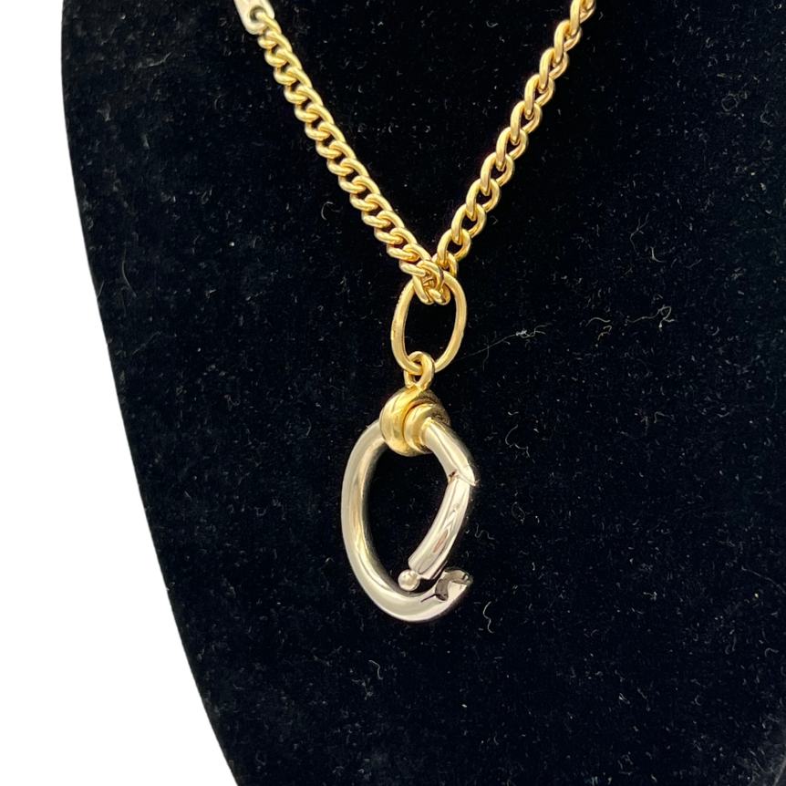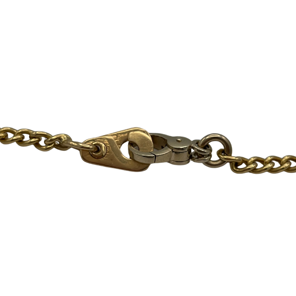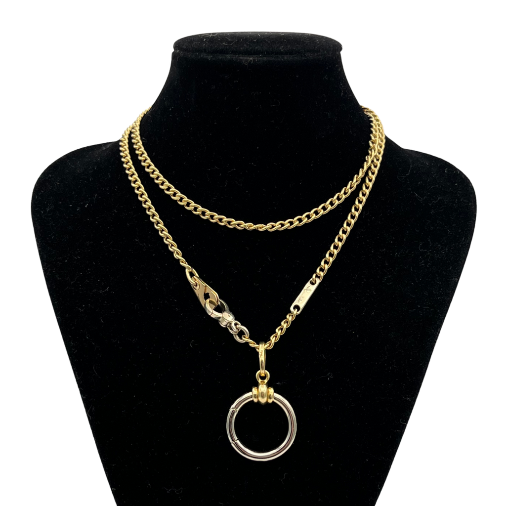Vintage signed Pomellato chain necklace in 18k yellow and white gold with a fob clasp and scissor clasp. The necklace features a round hinged ring pendant, perfect alone or for adding extra charm accessories.