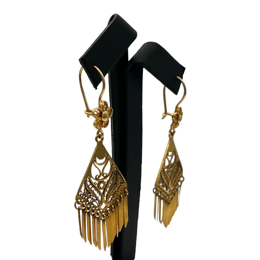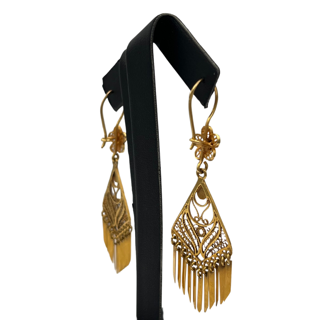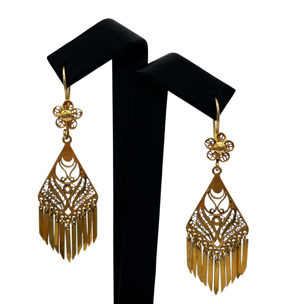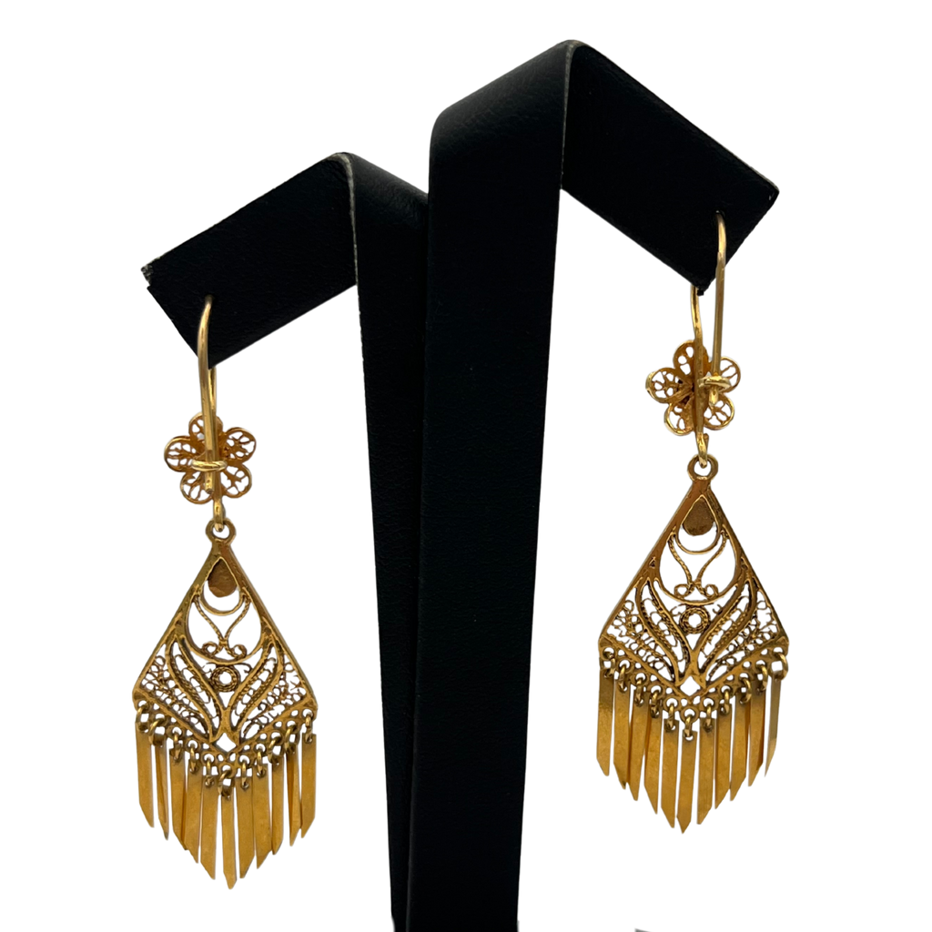 Vintage 14k yellow gold articulated drop earrings with a floral and fine twisted wire motif, with an articulated tassel style design. Earrings are worn with a shepherd's hook mechanism.