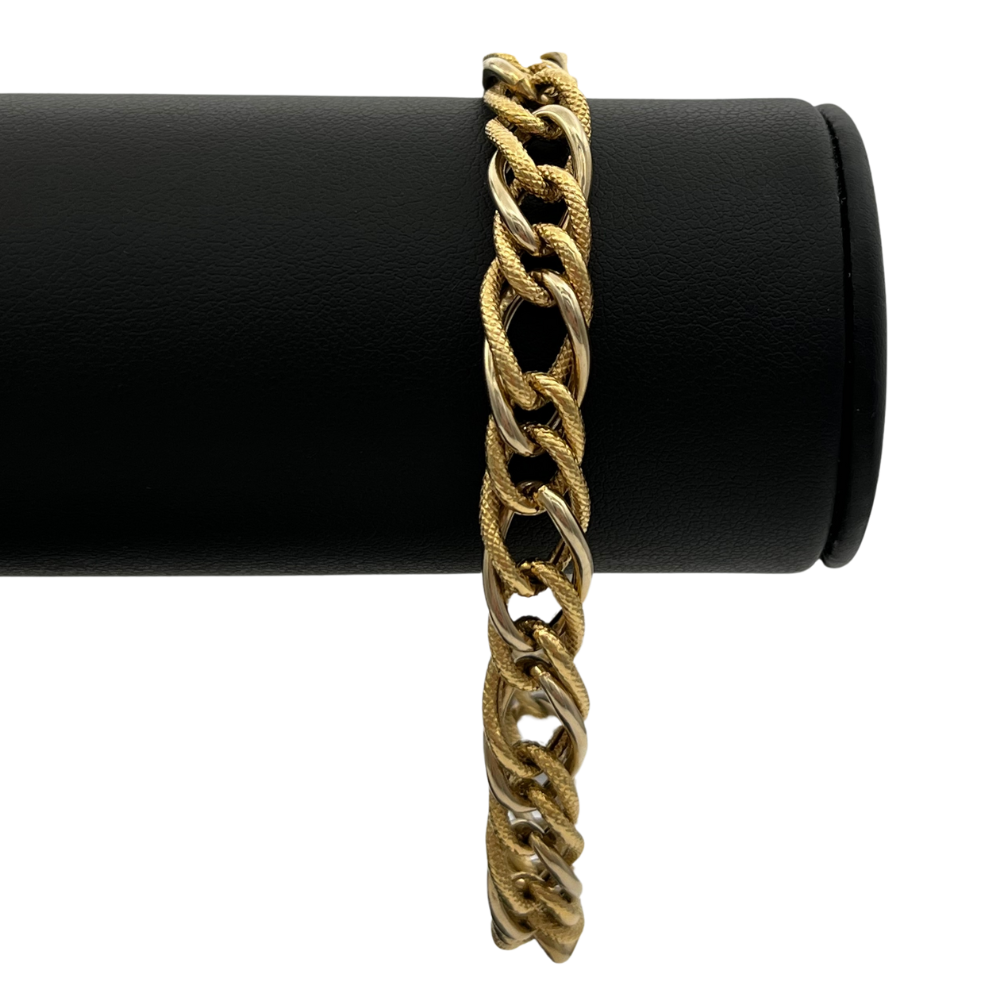 llow gold braided link bracelet with contrasting high polish and cross-hatched finish links. Fastens with a fancy large lobster clasp.