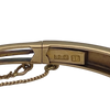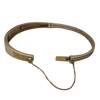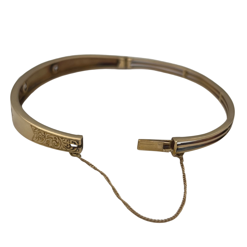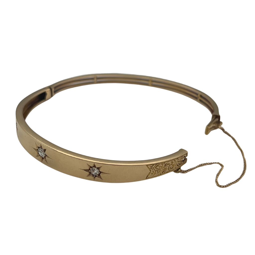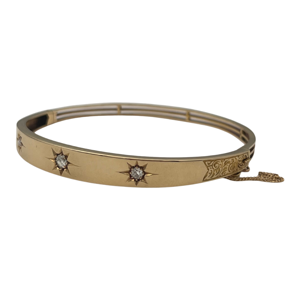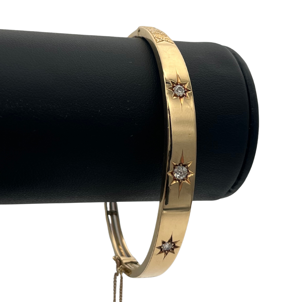 Vintage high polish hinged bangle bracelet with diamonds set in starburst motif and engraved decorative scroll design on the sides. The bracelet connects with a push clasp and has a safety chain.