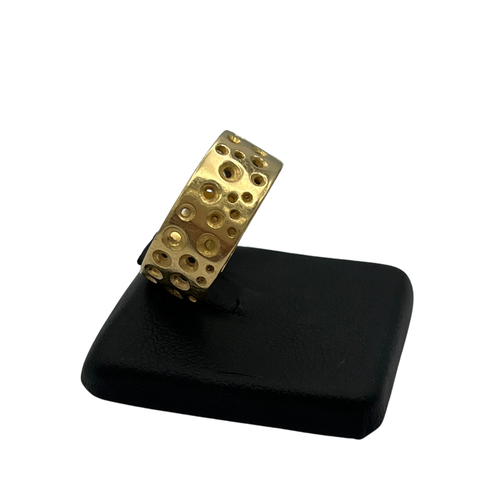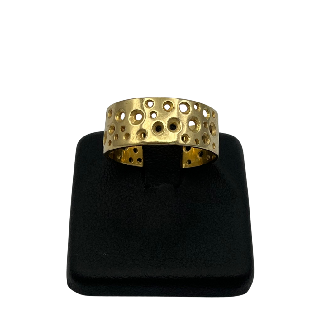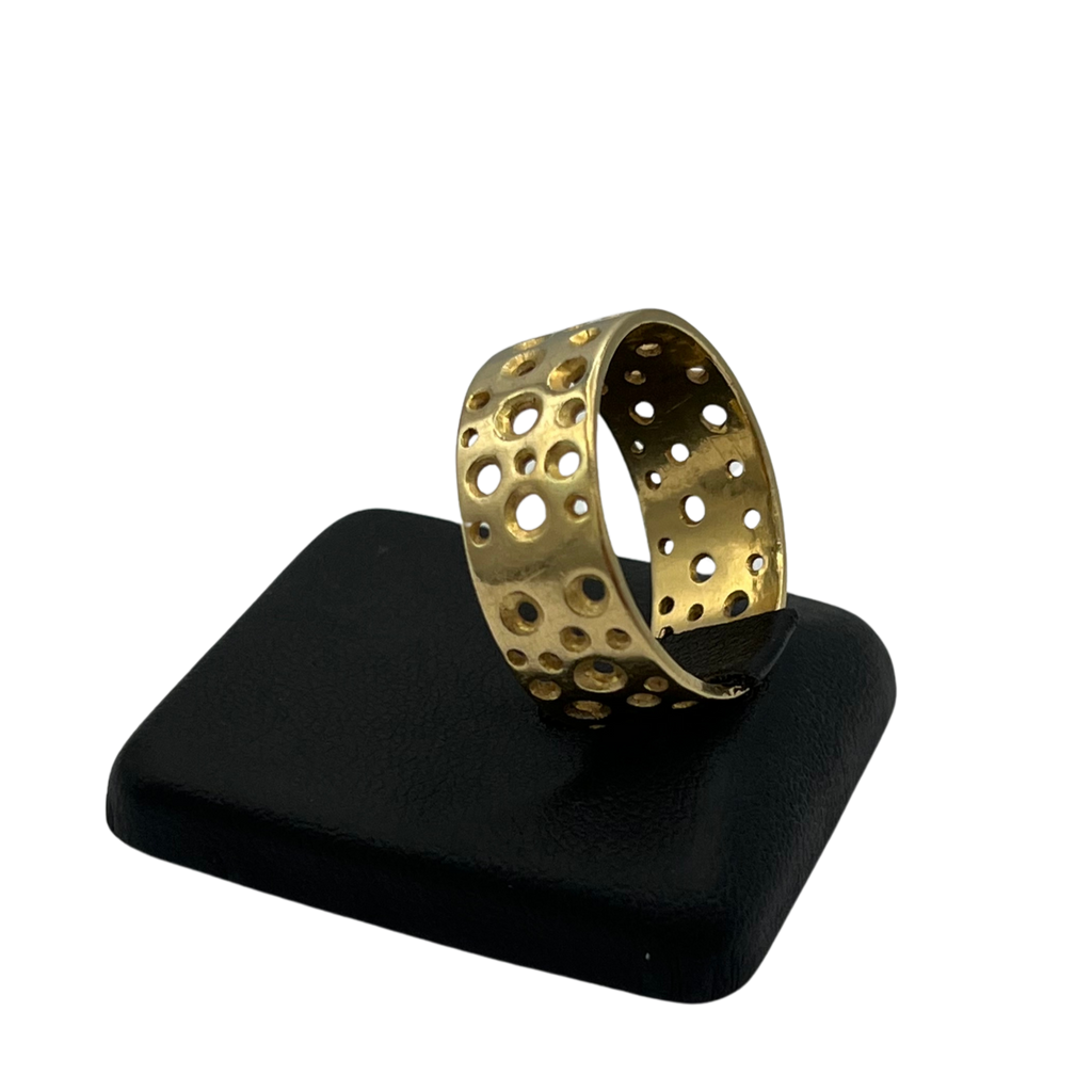 Vintage 18k solid yellow gold, wide band ring with a funky perforated hole design resembling the "Swiss Cheese" effect.