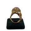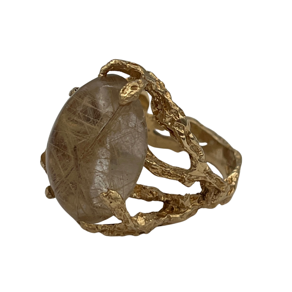 Vintage rutilated quartz cabochon set in an abstract, textured 14k yellow gold ring. This variety of quartz, also known as 'Venus' Hair Stone', is valued for it's golden needle-like inclusions visible in the stone.