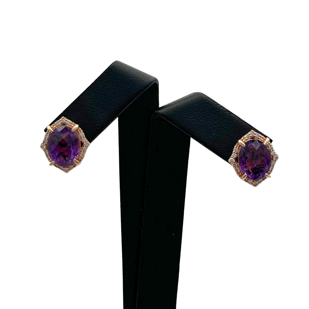 Vintage stud earrings with a checkerboard facet amethyst center stone surrounded by a frame of pavé diamonds in 14k rose gold.