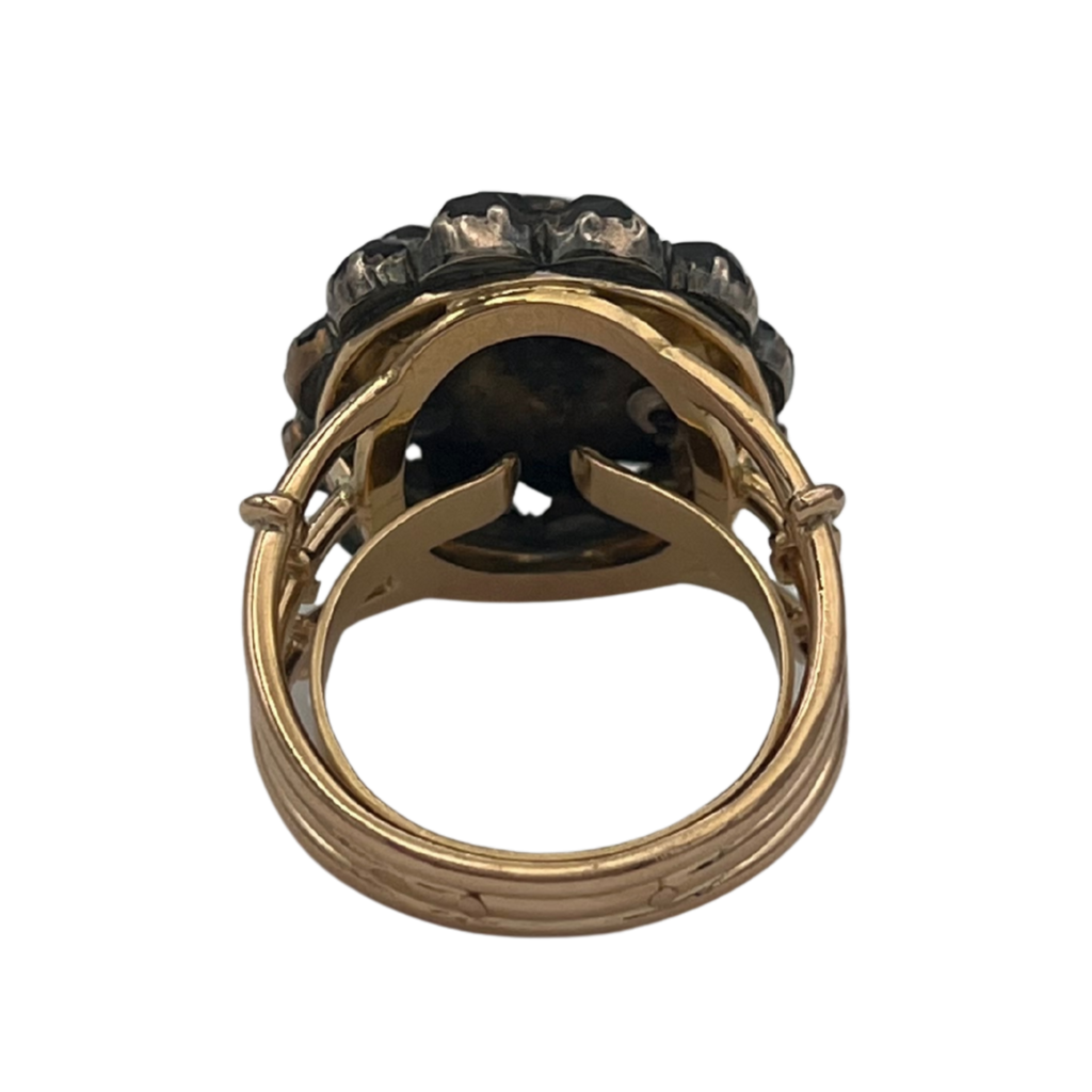 This ring features an antique garnet cluster gallery set in silver, on a vintage 18k rose gold tri-split shank with U-guard on band interior for sizing.