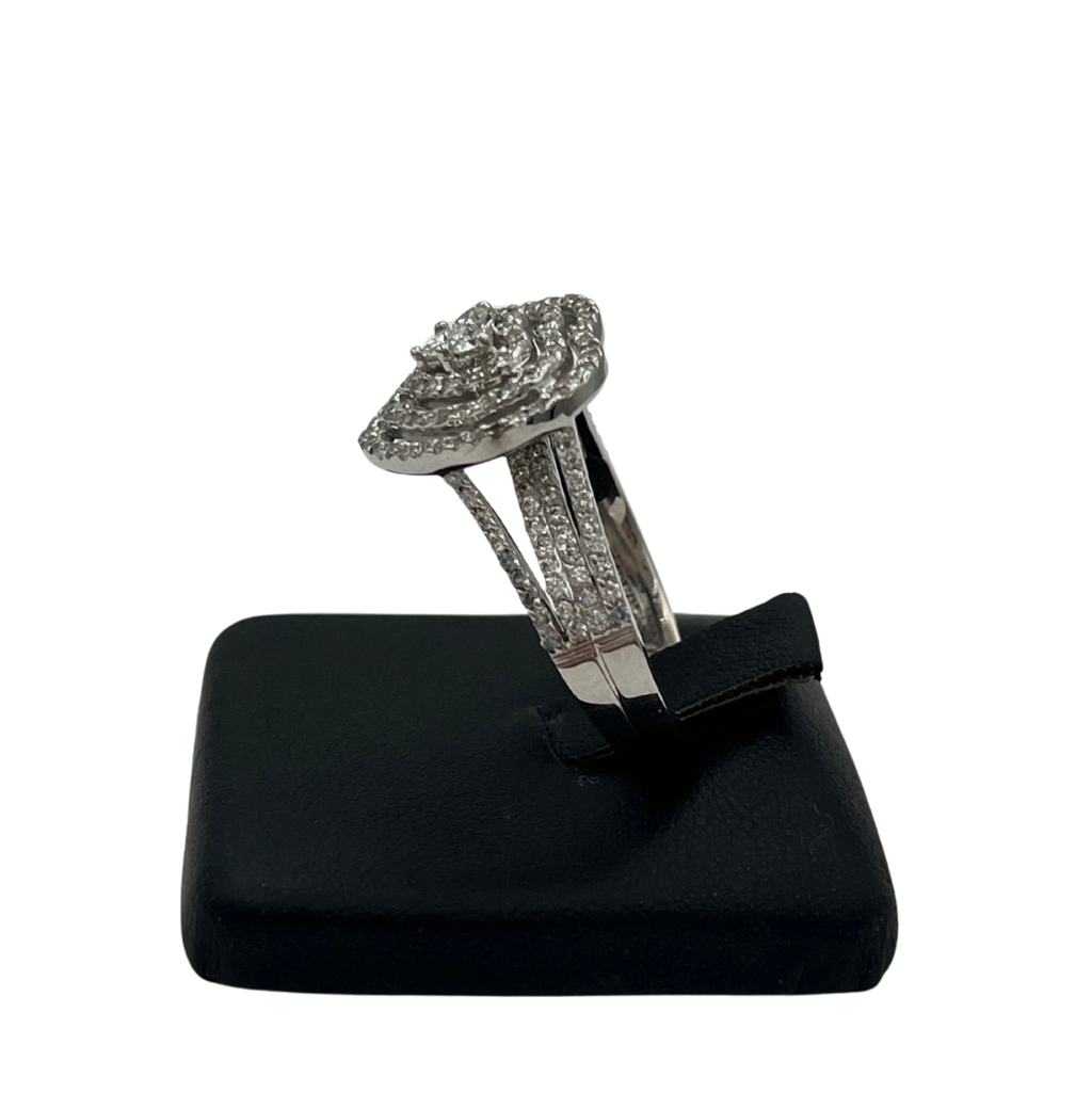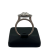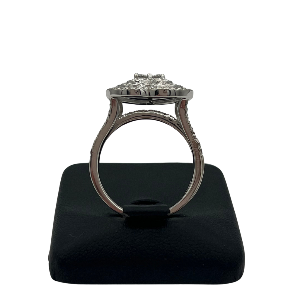 Three larger prong set diamonds make up the center heart. One (1) princess cut diamond measuring approximately 2.4mm x 2.4mm. Two (2) round brilliant cut diamonds measuring approximately 2.5mm each in diameter with an estimated VS clarity and F/G colour.