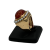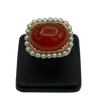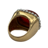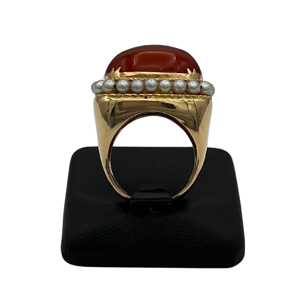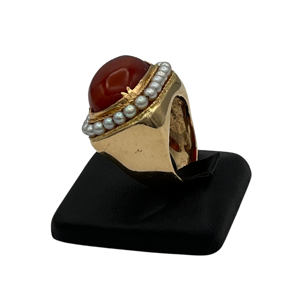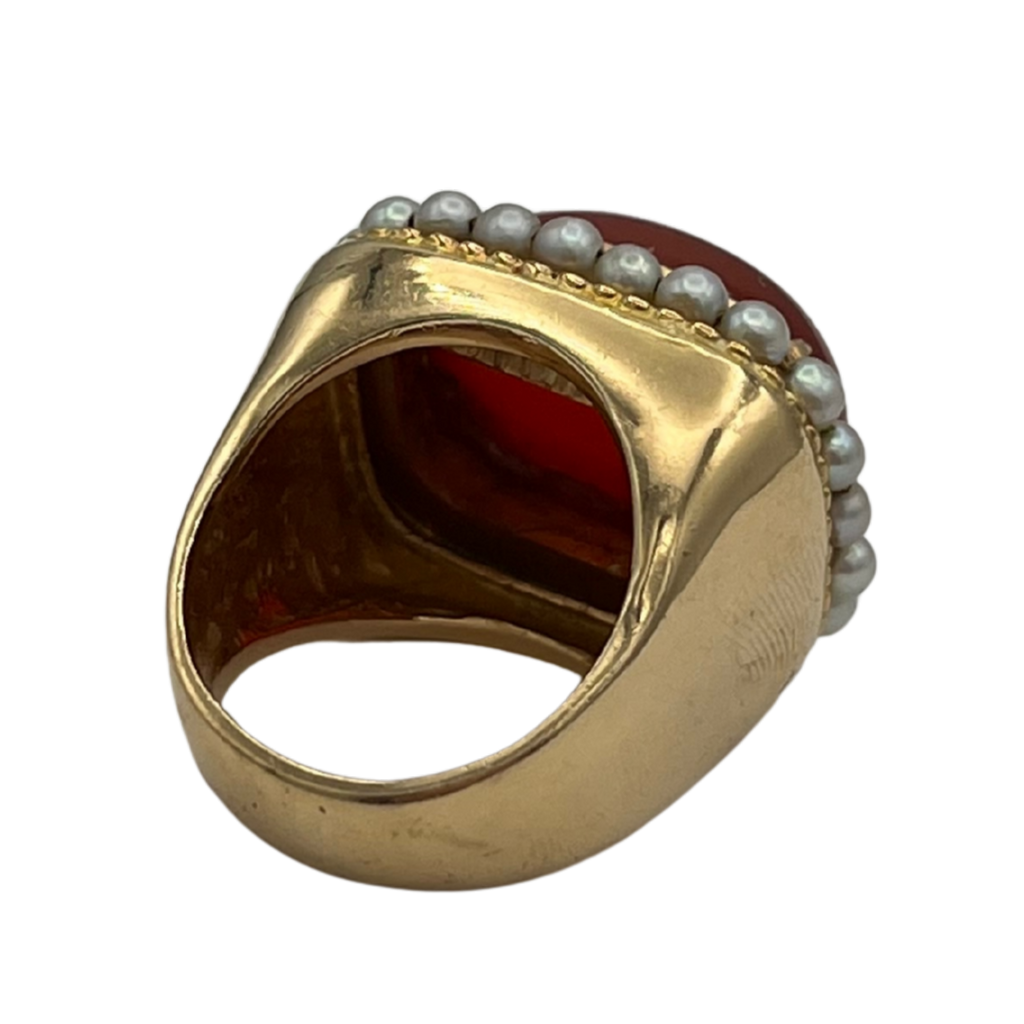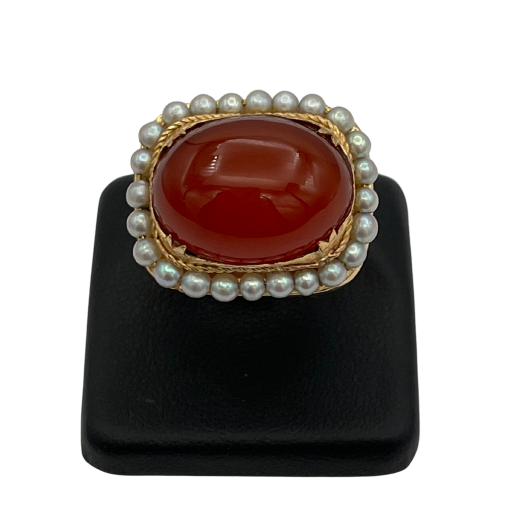 Beautiful vintage ring from the 1940's featuring an oval cabochon cut carnelian stone set with an East/West orientation, surrounded by a ring of wire-strung pearls. The band of the ring is made of solid 14k yellow gold with a high polish finish.