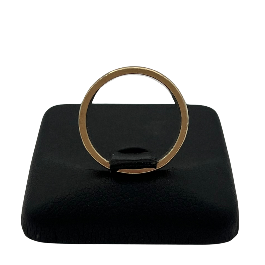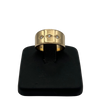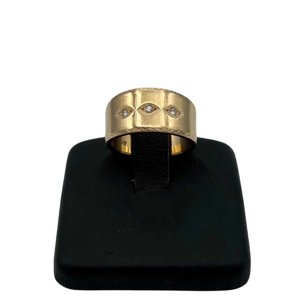 Designed to resemble the band on a cigar, the cigar band ring style has seen a jump in popularity recently. This lovely vintage solid 14k yellow gold ring features a satin (or brush) finish with an etched border and is adorned with three pre-set diamonds.