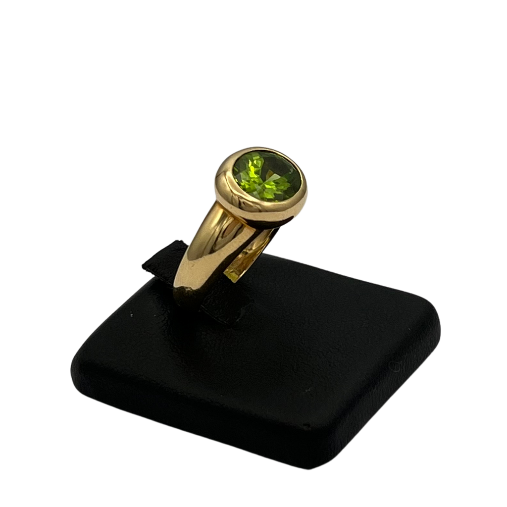 Gorgeous east-west peridot bezel set in 18k yellow gold with a high polish finish. Peridot has abrasion from light wear.
