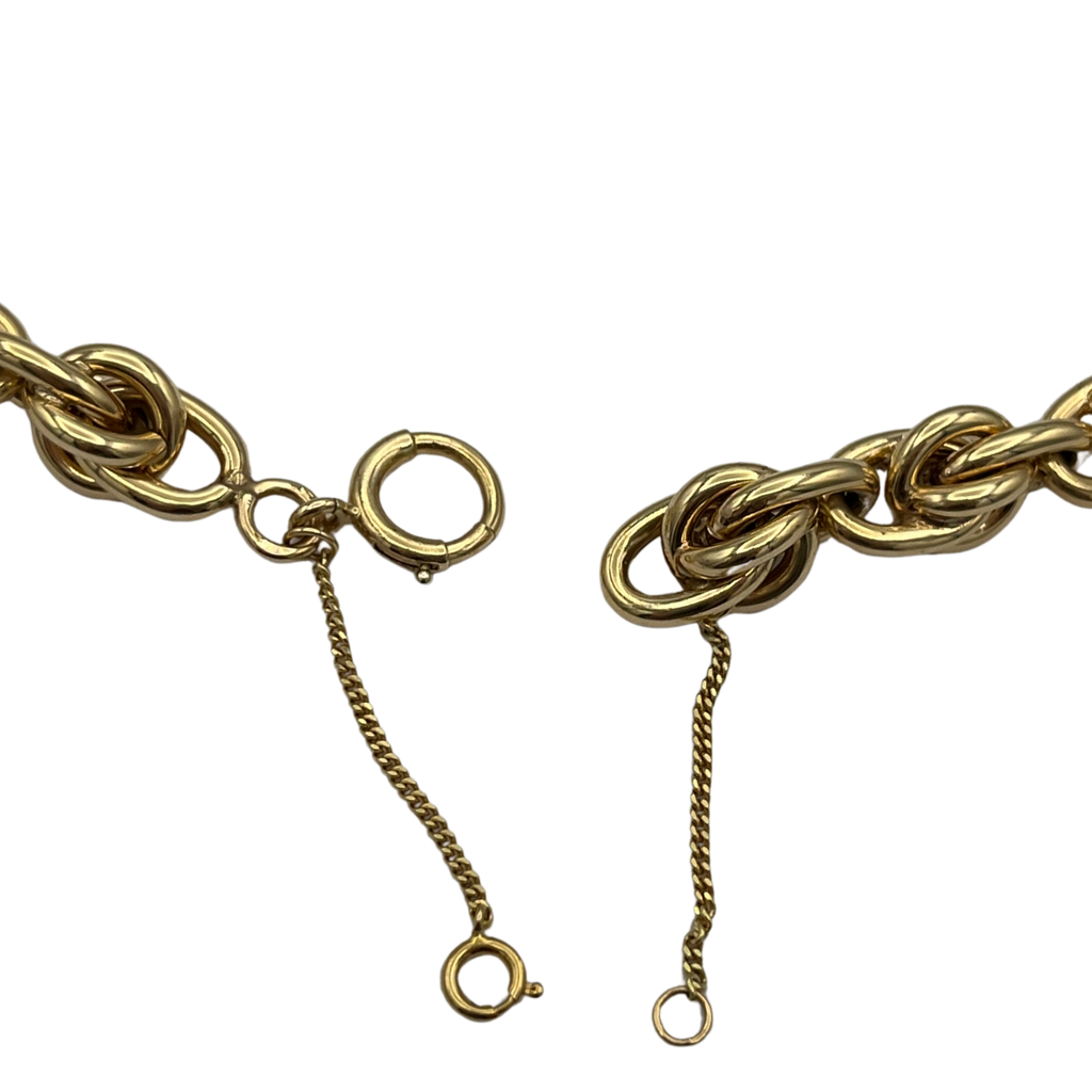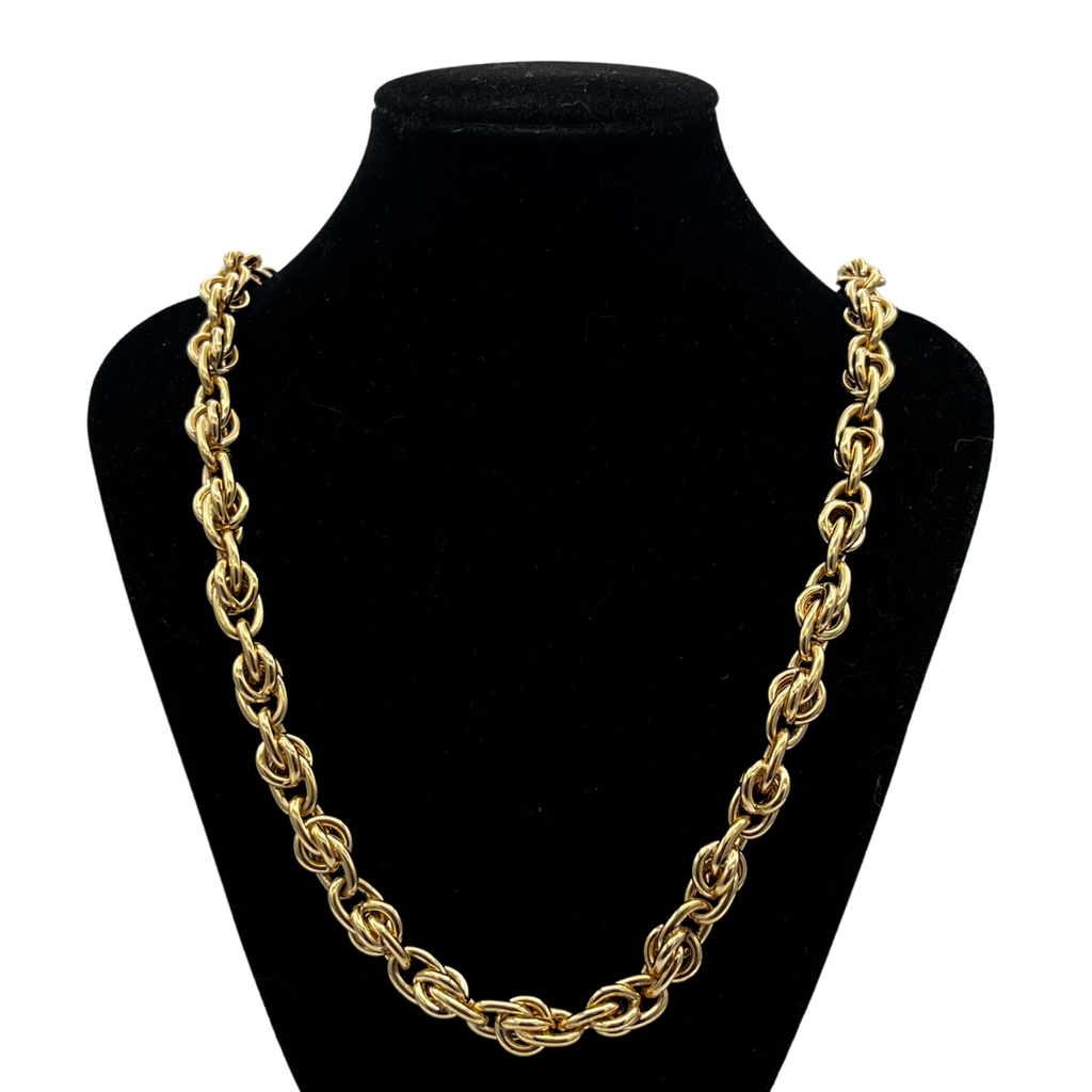 Beautiful vintage heavy hollow 14k yellow gold interlocking fancy link chain necklace with a high polish finish. Gold thickness is approximately 1.5mm thick which guarantees this piece will stand the test of time. Necklace has a safety chain which attaches in the middle with a closure.