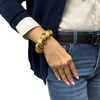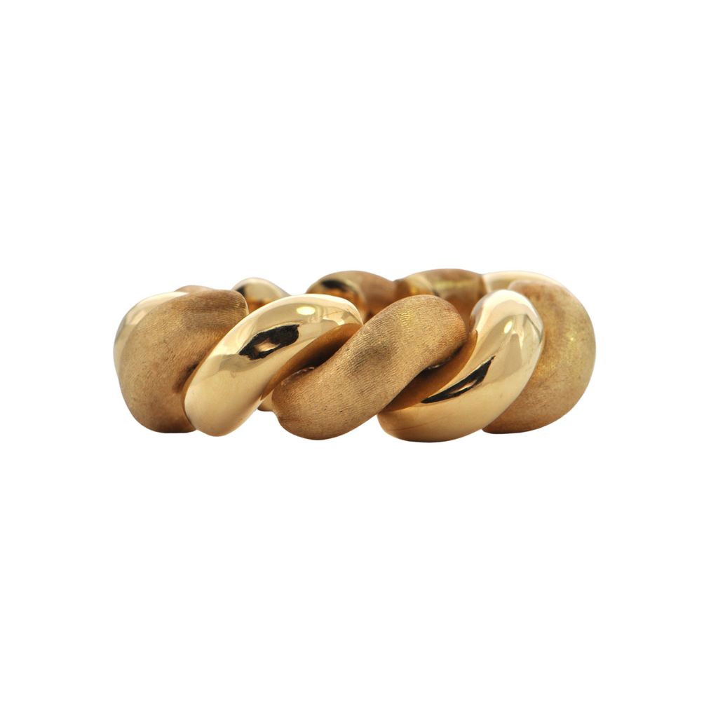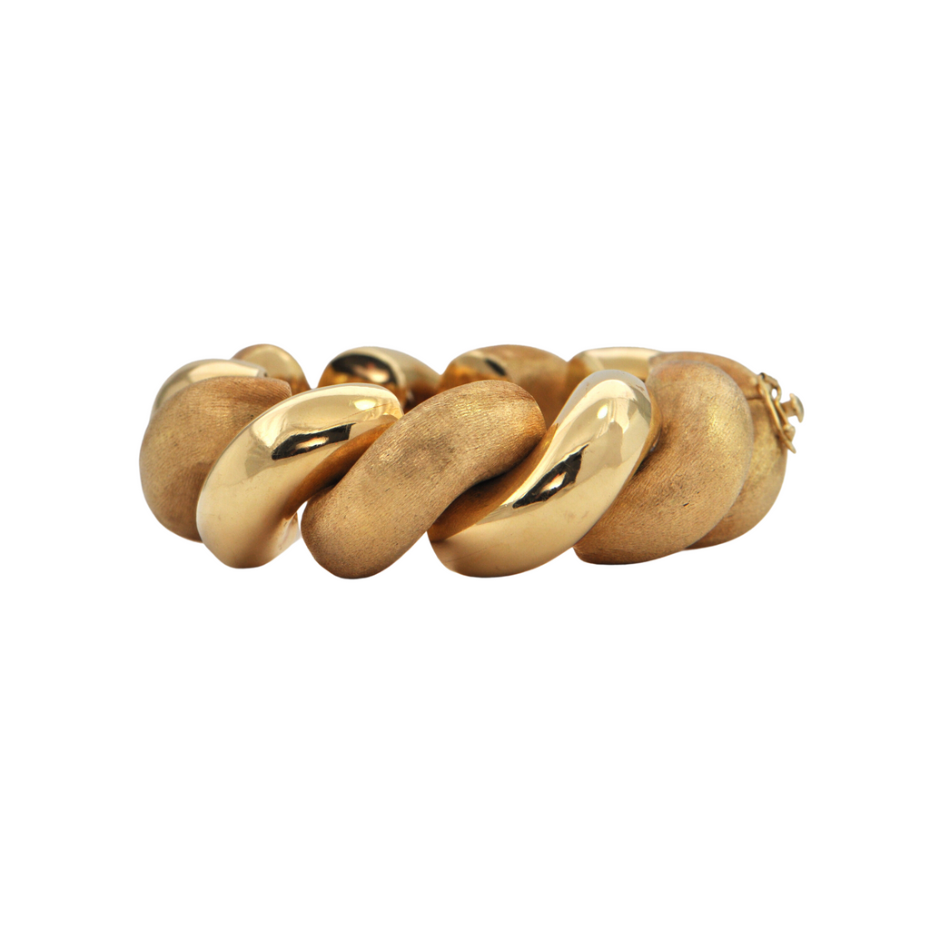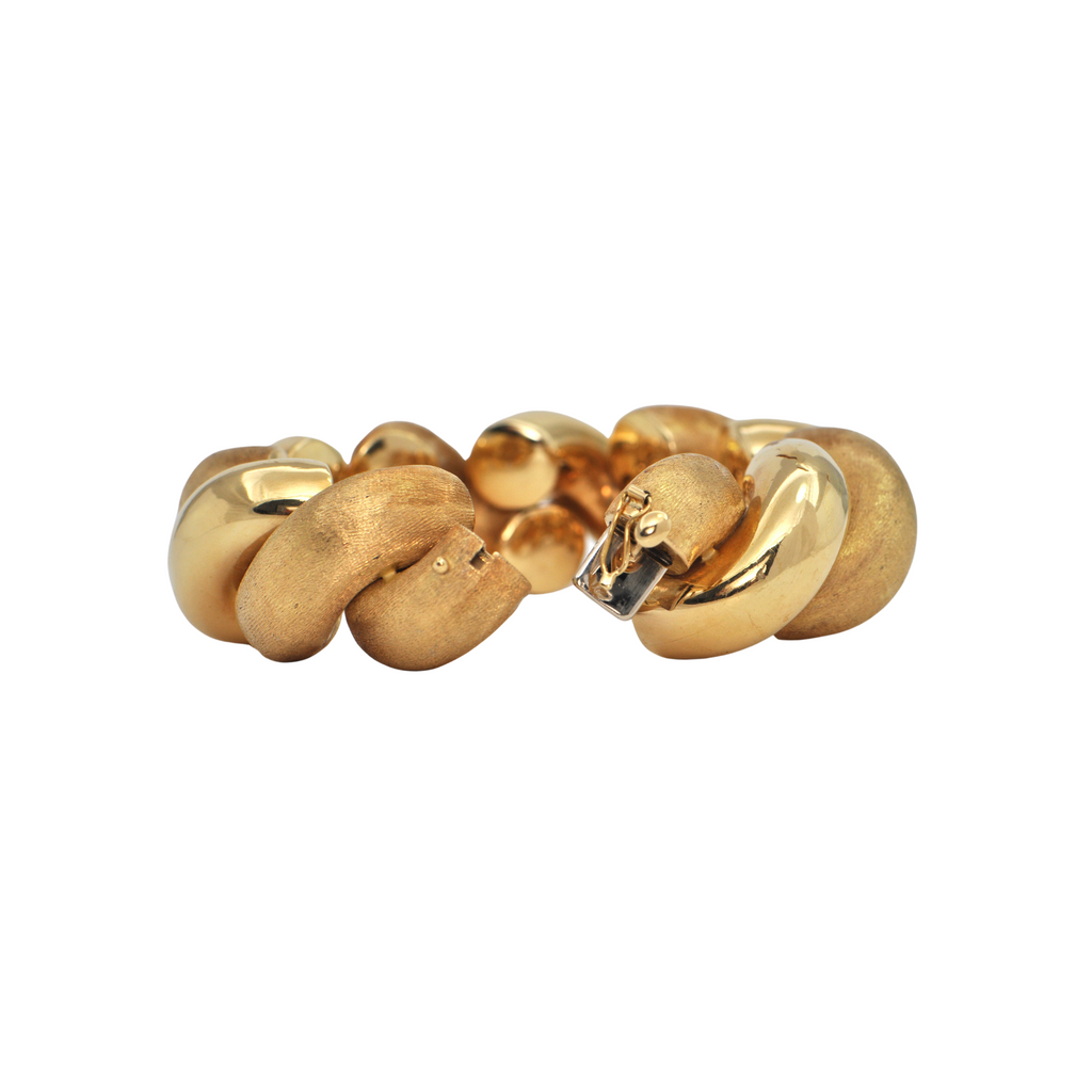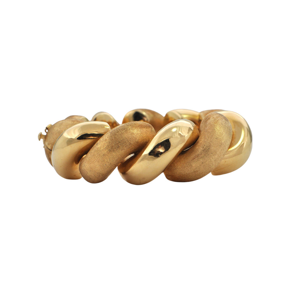 Bold and fabulous! Measuring 1 inch in width, A statement definitely will be made with this Italian 18k yellow gold twisted high polish and Florentine finish bracelet. Well known as the "San Marco bracelet" the design originating and made in Venice, it is named after the most iconic Piazza in the city.