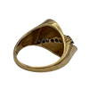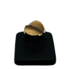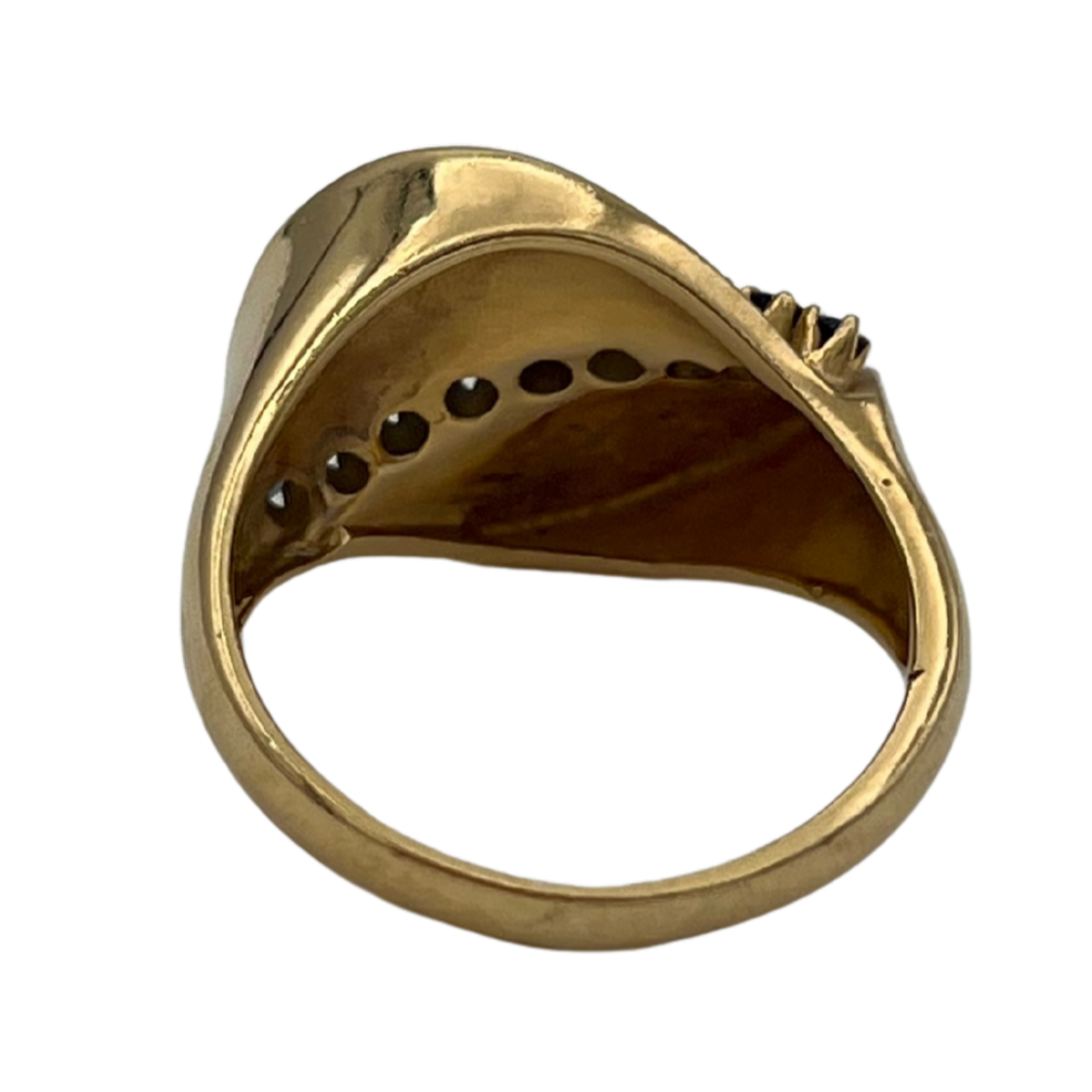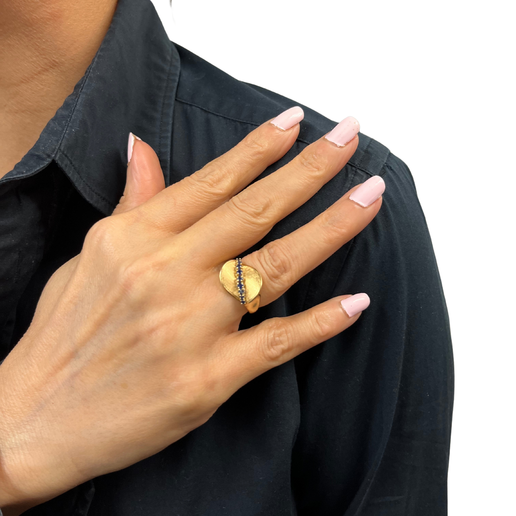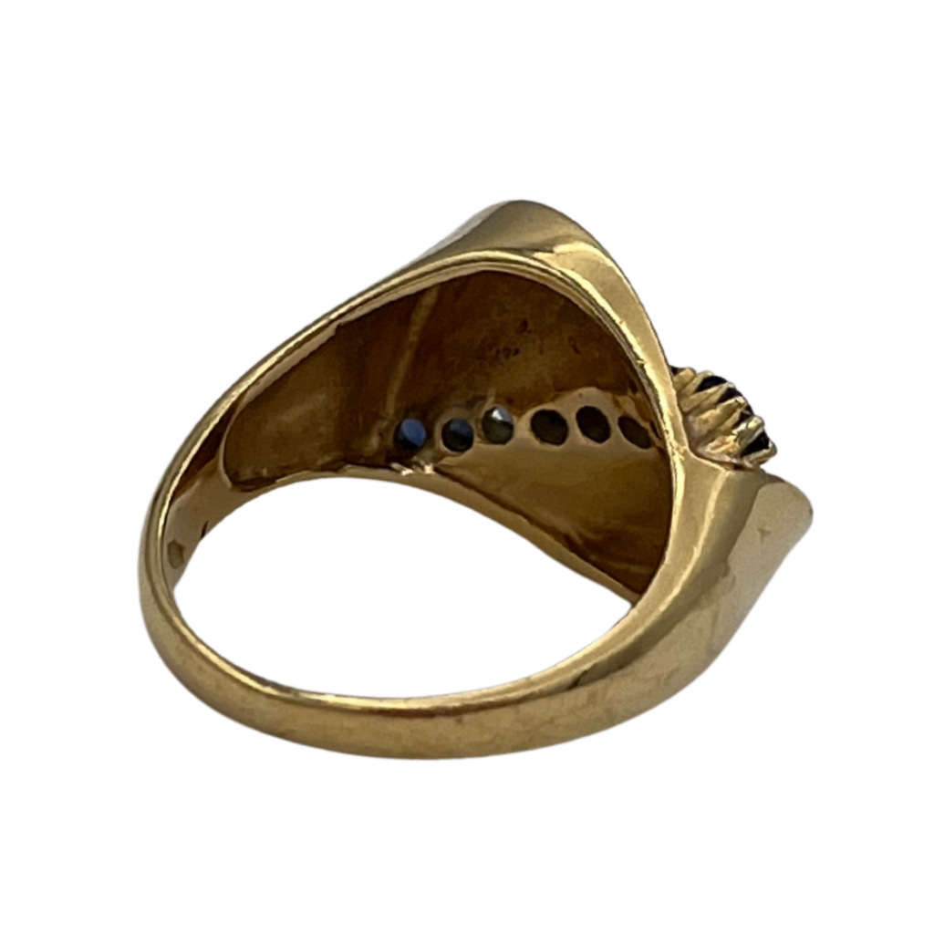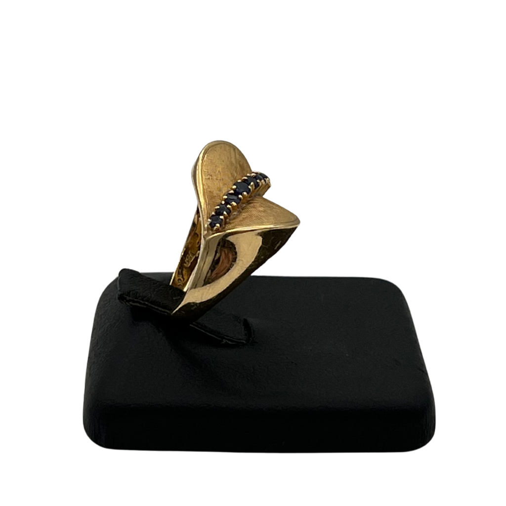 Vintage Italian 18k yellow gold ring in an asymmetrical curved design with a graduated line of sapphires running through it and a contrasting high polish and cross-hatch brushed finish.