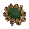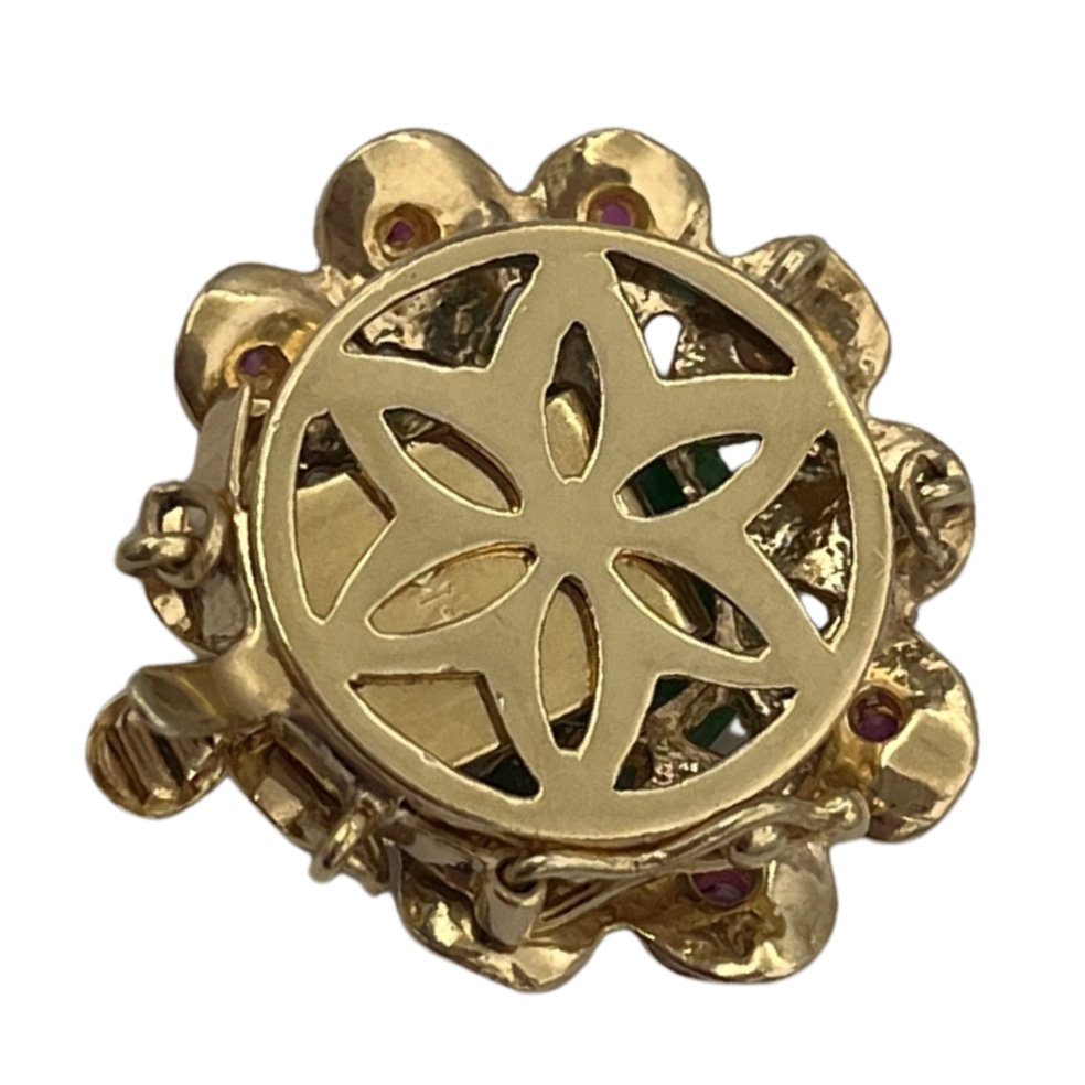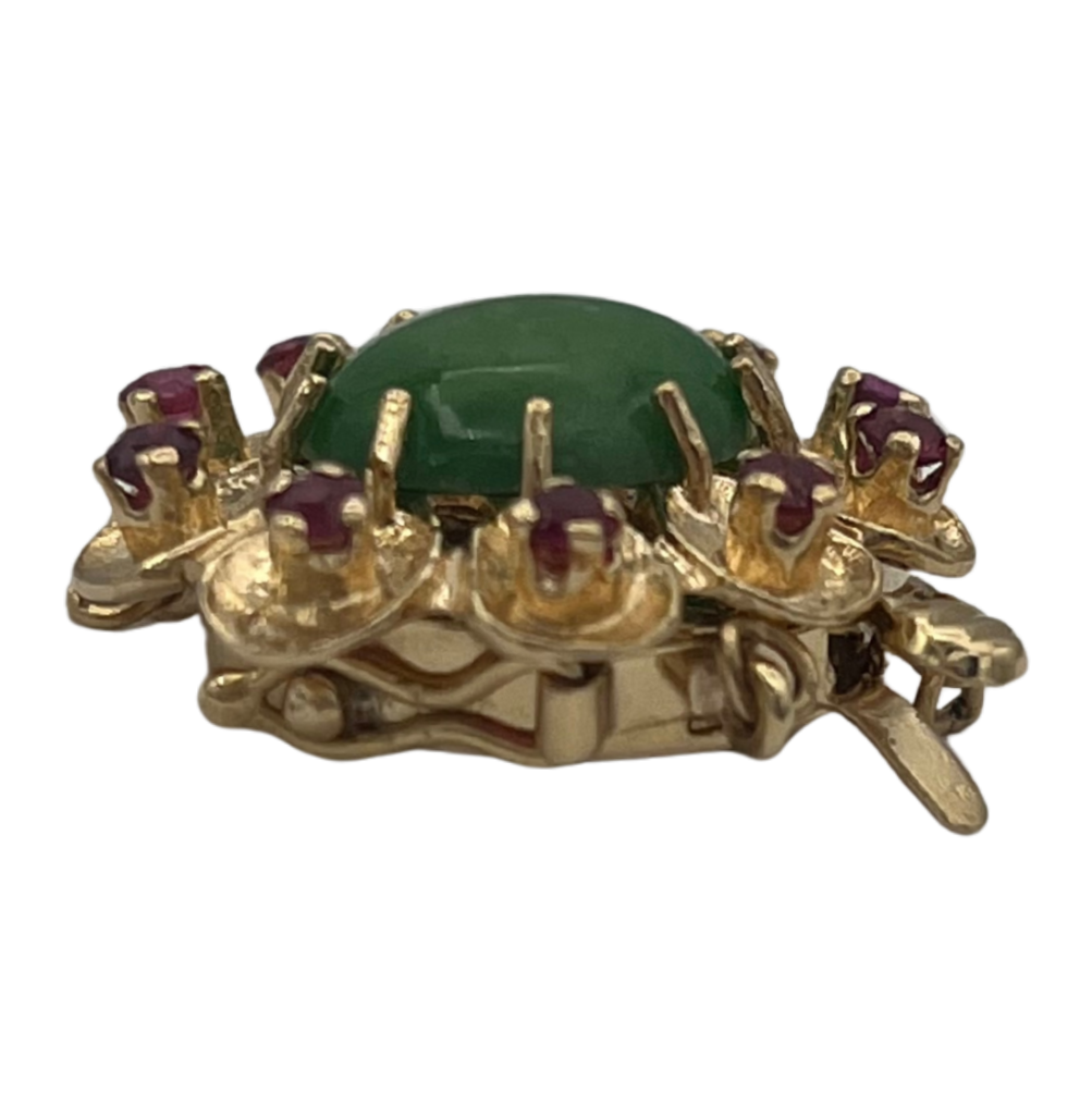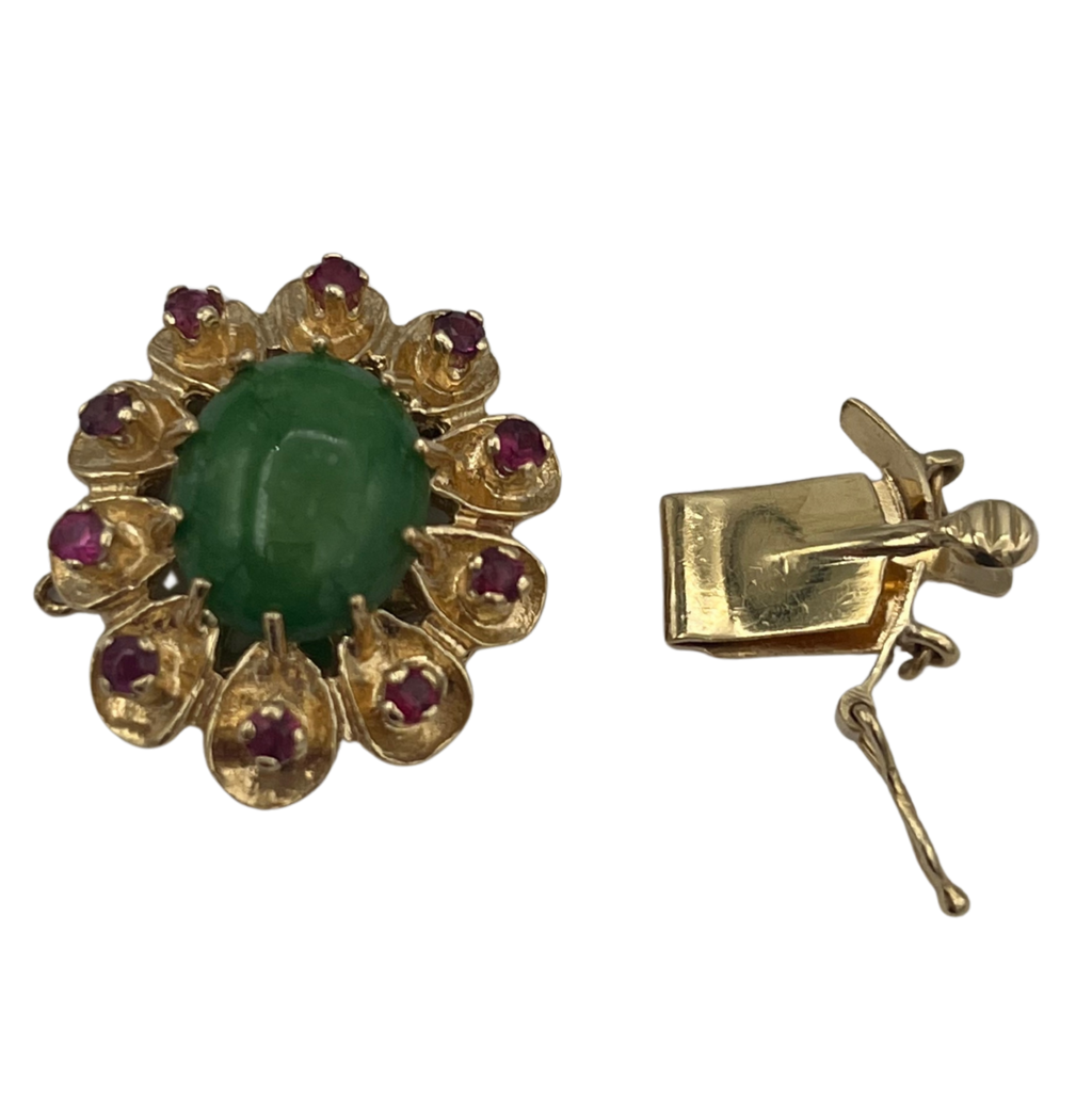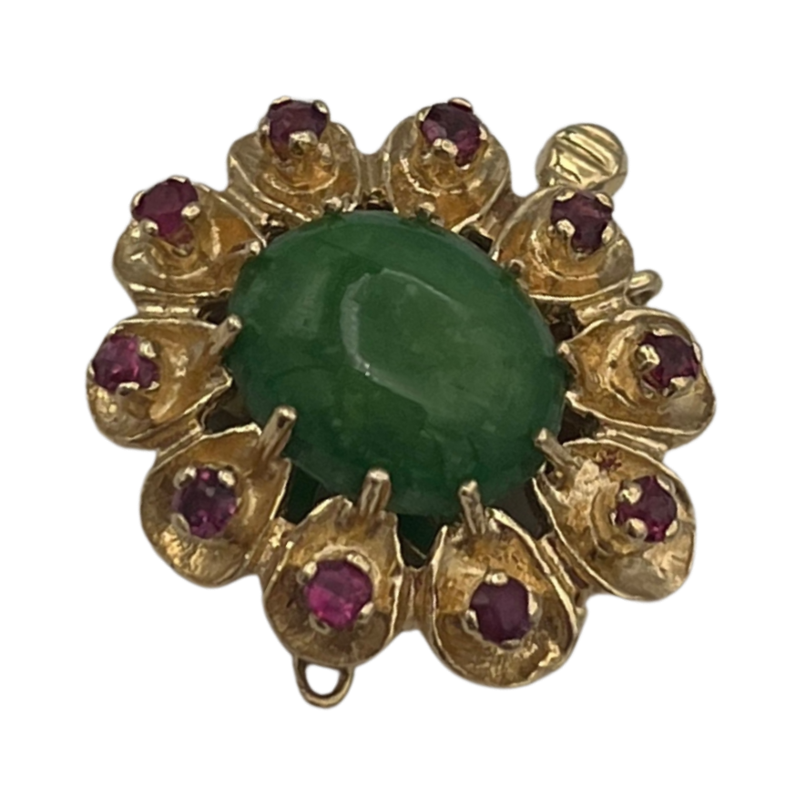 Vintage retro flower-shaped two-strand push clasp centered with a cabochon cut jadeite jade stone, and rubies on each of the petals. The clasp has one figure-eight safety lock.