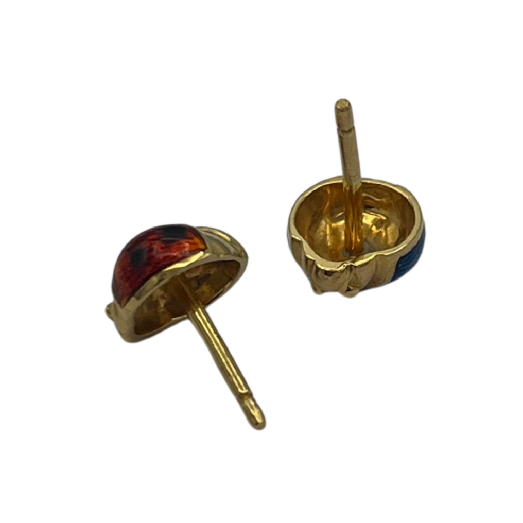 Vintage red and blue enamel ladybug stud earrings in 18k yellow gold.